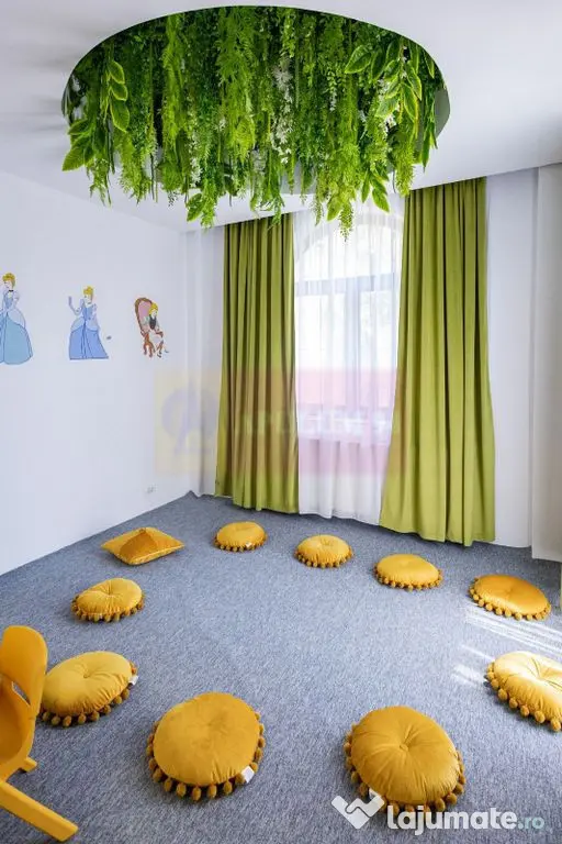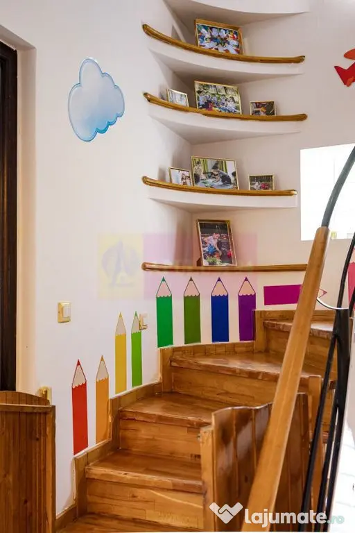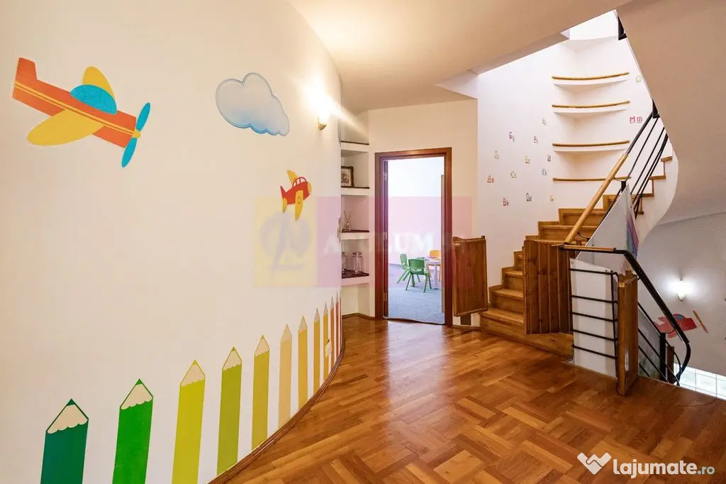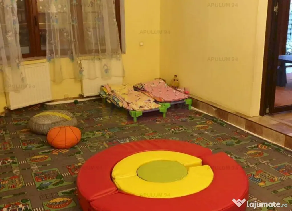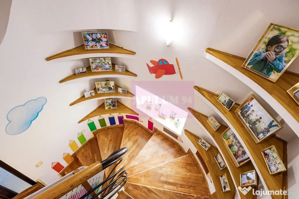 Vila este finalizată dupa anul 2004, structurata pe 4 nivele, Demisol, Parter, Etaj si Mansarda, cu o suprafata utila de aproximativ 120mp/nivel. La Demisol avem adapost de tip ALA, doua camere tehnice, centrala termica de mare putere, rezervor 1000 de litri apa menajera, bucatarie echipata cu aparatura profesionala, grup sanitar cu dus pentru personal la demisol. Parterul este primitor si luminos, cu zona de depozitare, cu sali pentru activitati si/sau odihna, luat masa, camera pentru citit cu semineu, zona de joaca, birou -personal administrativ, acces terasa si curte, curtea este suficient de spațioasă pentru tot felul de activități, aproximativ 250mp, la etaj se urcă pe o frumoasă scară, etaj unde avem deasemenea mai multe săli multifuncționale ce pot fi folosite atat pentru activitați diverse, tot aici avem și un grup sanitar spatios cu strictul necesar pentru cei mici, un balcon mare tip terasa cu vedere spre curtea proprie, mansarda este gandita ca un apartament pentru locuit dar se poate schimba ca destinație daca se doreste, aici ne bucuram de spații mari, ferestre tip velux, și de multa lumină naturală ca de fapt in intreaga vilă. Înaltimea camerelor permite asfel orice artificiu de design și amplasarea de aparatură și mobilier.