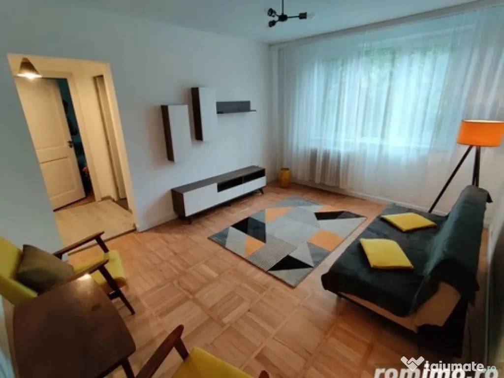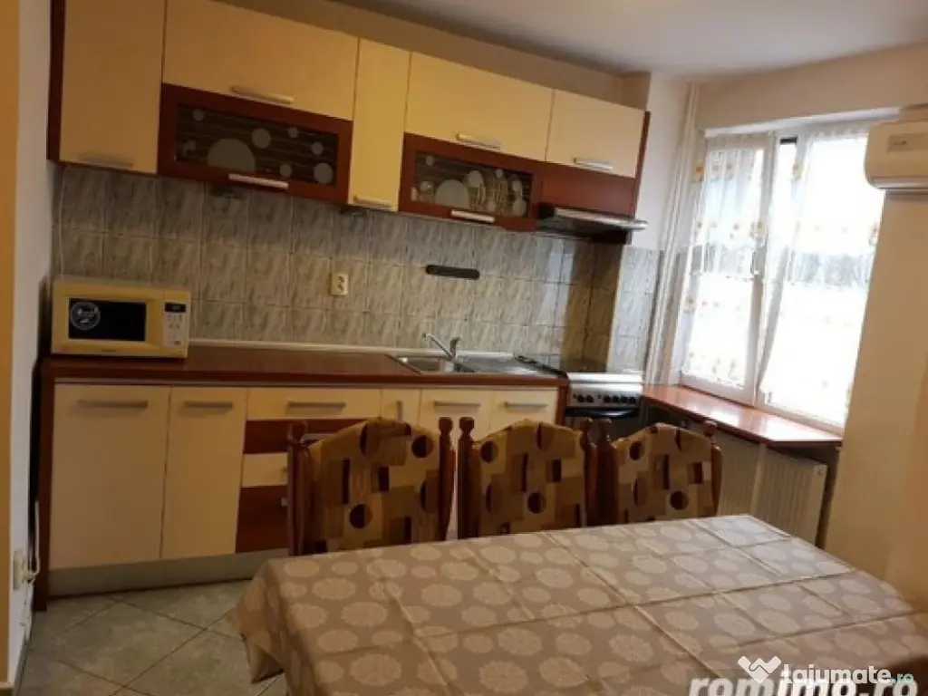 De inchiriat 2 camere semidecomandat complet mobilat si utilat :masina de spalat rufe , frigider , aragaz , geamuri termopan , gresie ,faianta , parchet laminat. Situat in zona Soarelui , statie de autobuz la 300 m. Suprafata 55 mp , etaj 2. Confort: 1 Tip imobil: Bloc de apartamente