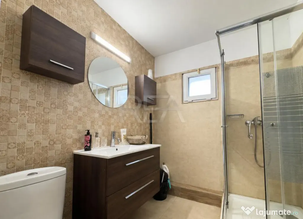 Baia e deja modernizată, cu duș walk-in — simplu, curat, fără bătăi de cap.