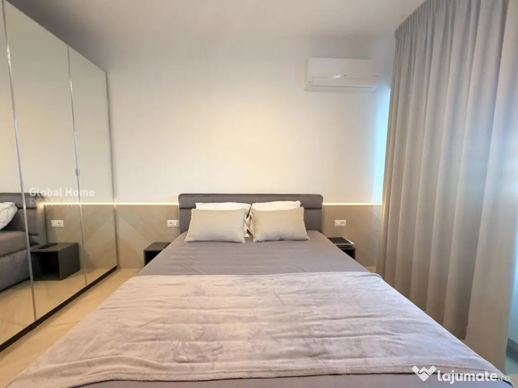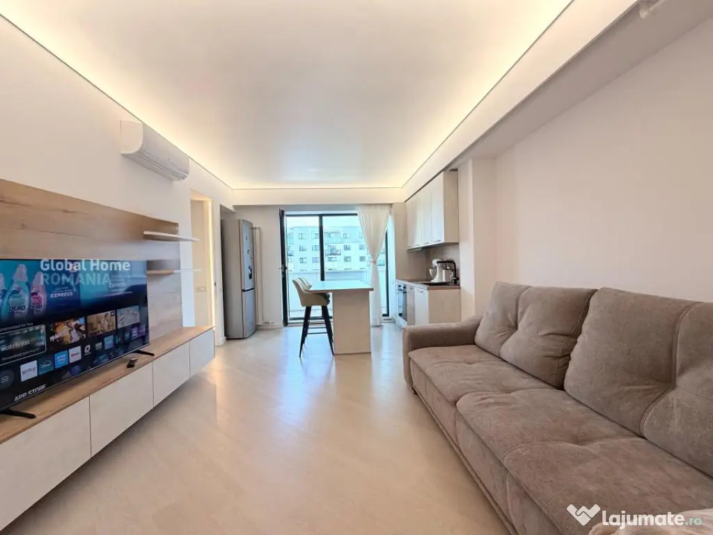 Apartamentul de 2 camere beneficiază de finisaje de calitate superioară și design modern. Mobilier premium, inclusiv bucătărie cu insulă, pat cu ladă de depozitare și canapea extensibilă. Electrocasnice de top: Două aparate de aer condiționat, Combină frigorifică, Televizor, Plită electrică, Cuptor electric, Hotă, Mașină de spălat vase, Mașină de spălat rufe cu uscător încorporat. Spații de depozitare generoase, integrate armonios în designul interior. Balcon cu vedere asupra zonei rezidențiale, ideal pentru relaxare. Fiecare detaliu gândit pentru confort și funcționalitate maximă.
