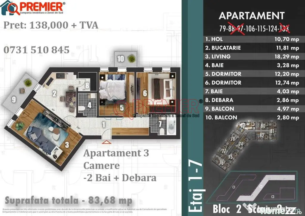 Suprafața utilă este de 83,68 mp, cu o compartimentare eficientă și spații bine organizate, ideale pentru locuit.