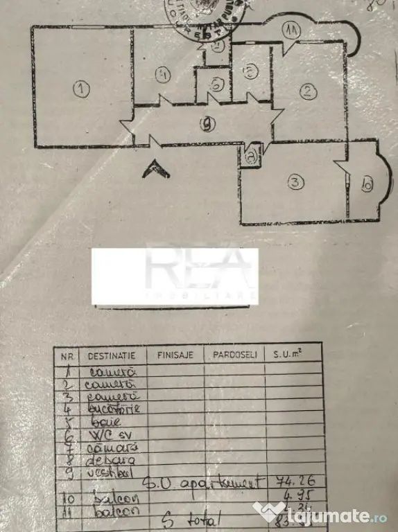 Se află la etajul 6 al unui bloc cu 8 etaje și are o suprafață utilă totală de 83 mp, din care 9 mp sunt reprezentati de cele doua balcoane.