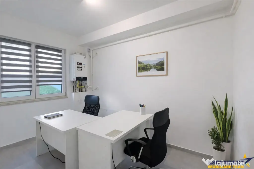 Spatiul este la stadiul finisat pentru birouri si beneficiaza si de 2 locuri de parcare (exterior), acesta din urma se poate prelua optional cu extra pret.