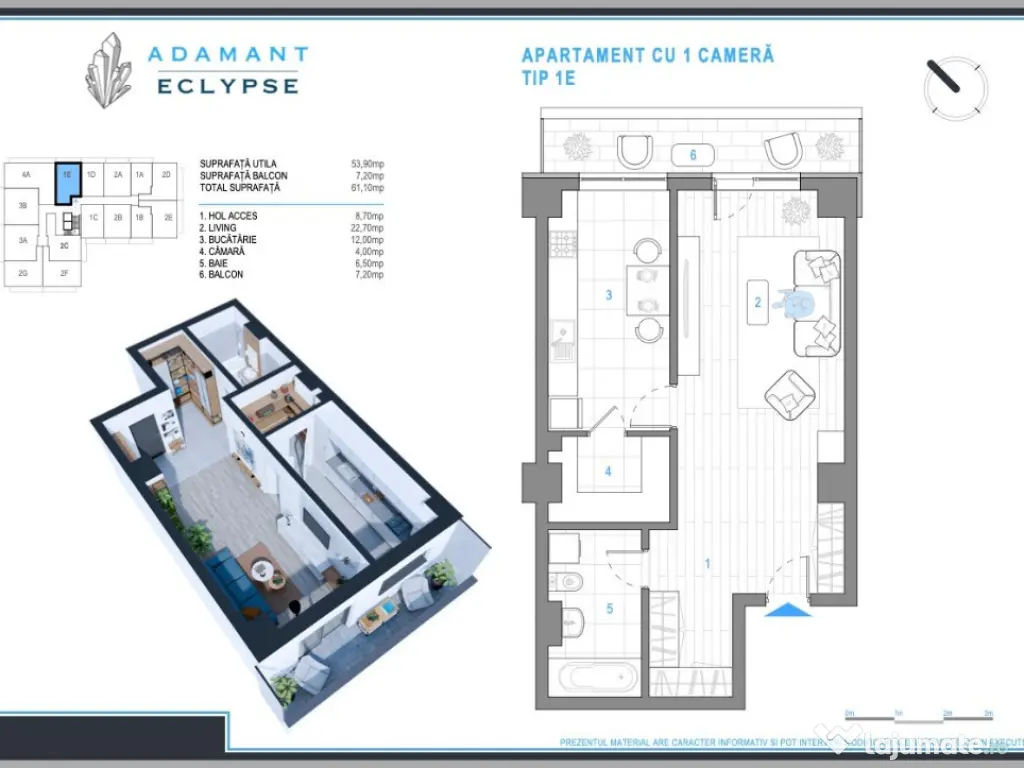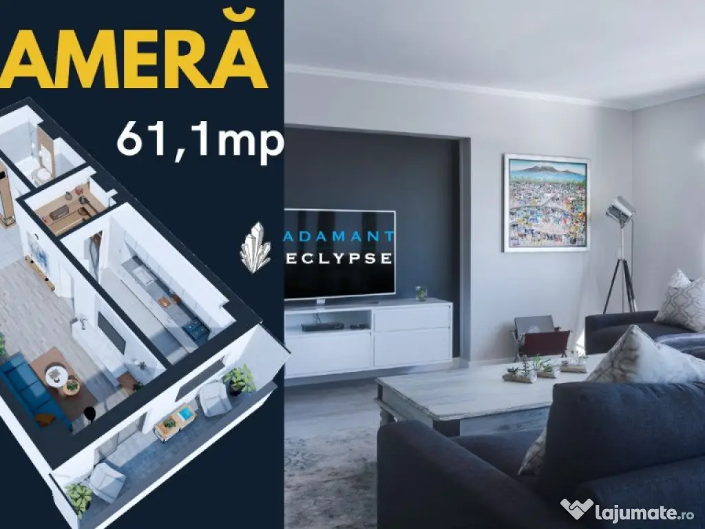 ADAMANT ECLYPSE - un complex de apartamente în care confortul și designul modern se întâlnesc pentru a-ți oferi stilul de viață pe care îl meriți! Indiferent dacă visezi la un apartament cozy sau la un spațiu generos, găsești variante de 1, 2, 3 și 4 camere, decomandate și open space, cu suprafețe între 44,3mp și 102,9mp. Amplasat strategic în zona CUG - Iași, pe strada Hlincea, în planul 2 la bulevard, beneficiezi de o locație liniștită și accesibilă, perfectă pentru a te bucura de viața urbană într-un mediu relaxant și prietenos. Detalii construcție: Structură pe cadre; Fundații de tip radier general; Structură din beton clasa C30/37; Zidărie BCA; Izolație cu vată bazaltică; Dotări și finisaje: 2 ascensoare de ultimă generație tâmplărie PVC 6 camere tripan, sticlă 4 season aparat de aer condiționat centrală termică în condensare băi echipate cu obiecte sanitare gresie, faianță din import parchet, uși interior calitate superioară casa scării amenajată în stil modern: pardoseli gresie, balustrade metalice. Facilități complex care îți transformă fiecare zi într-o experiență plăcută: acces securizat, video interfon, iluminat exterior, sistem de parcare subterană și supraterană, spații comerciale la parter. Apartament 1 camera, tip 1E, decomandat, suprafață totală 61,1 mp, suprafață utilă 53,9mp, suprafata balcon 7,2mp, compartimentat astfel: hol = 8,7mp, living = 22,7mp, bucatarie = 12mp, baie = 6,5mp. Apartamentul beneficiaza si de un spatiu de depozitare (camara) in suprafata de 4 mp, cu acces din bucatarie. MODALITĂȚI DE PLATA: - 103.500 euro + TVA - avans 50% - 109.250 euro + TVA - avans 30% - 115.000 euro + TVA - avans 10% Nu lăsa această oportunitate să îți scape! Contactează-ne astăzi și programează o întâlnire la biroul nostru de vânzări situat in Aleea Tudor Neculai nr.77D, Iasi. Confort: 1 Tip imobil: Bloc de apartamente Număr Băi: 1 Comision cumpărător: 0% Posibilitate parcare: Da