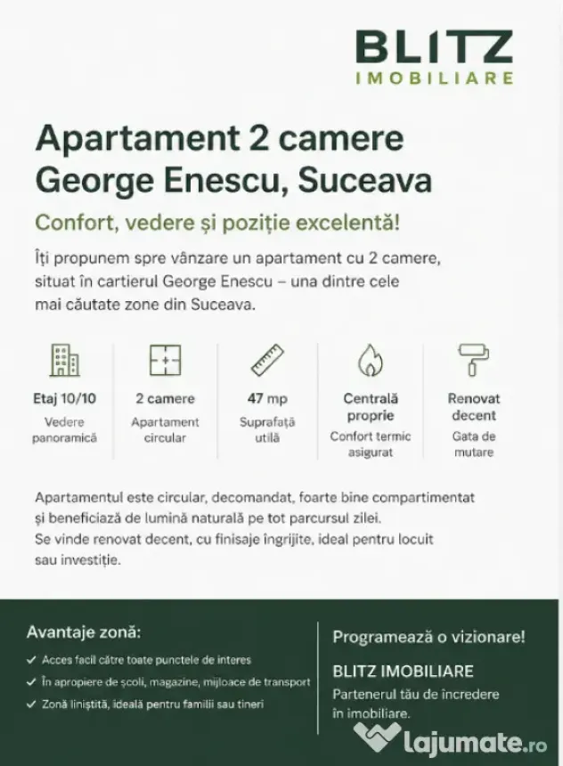 Blitz Imobiliare vă propune spre vânzare un apartament cu 2 camere, situat în cartierul George Enescu din Suceava, una dintre cele mai căutate zone ale orașului.
