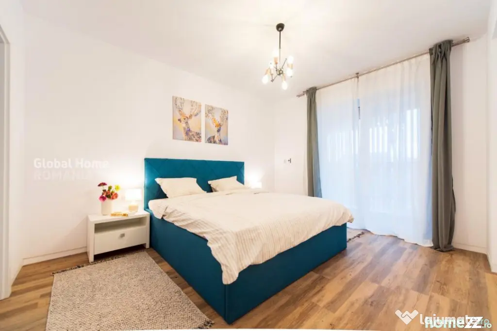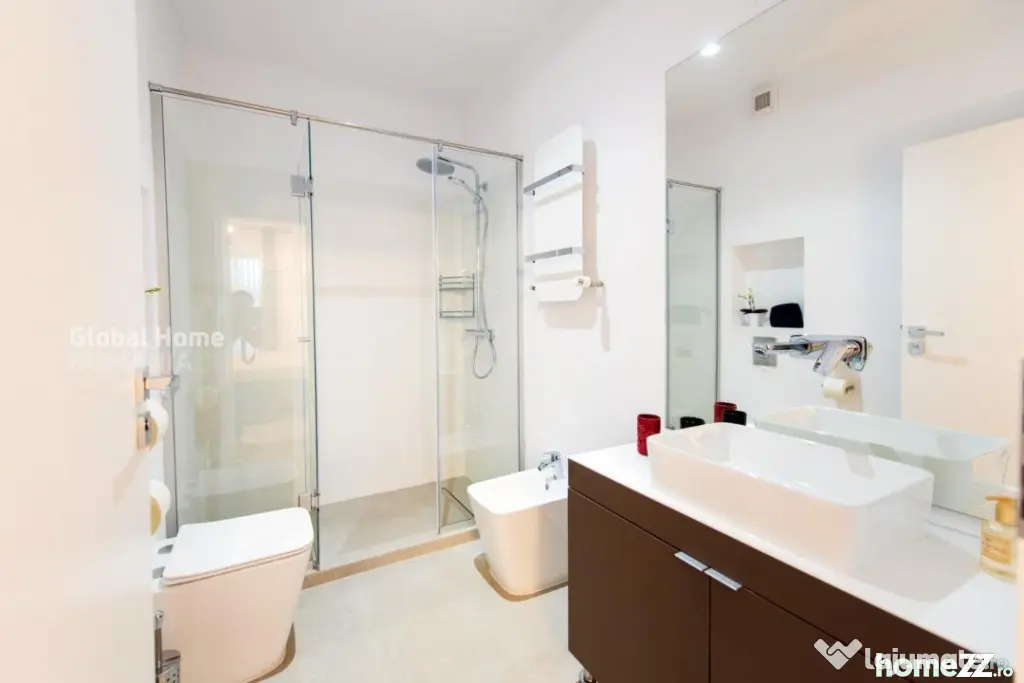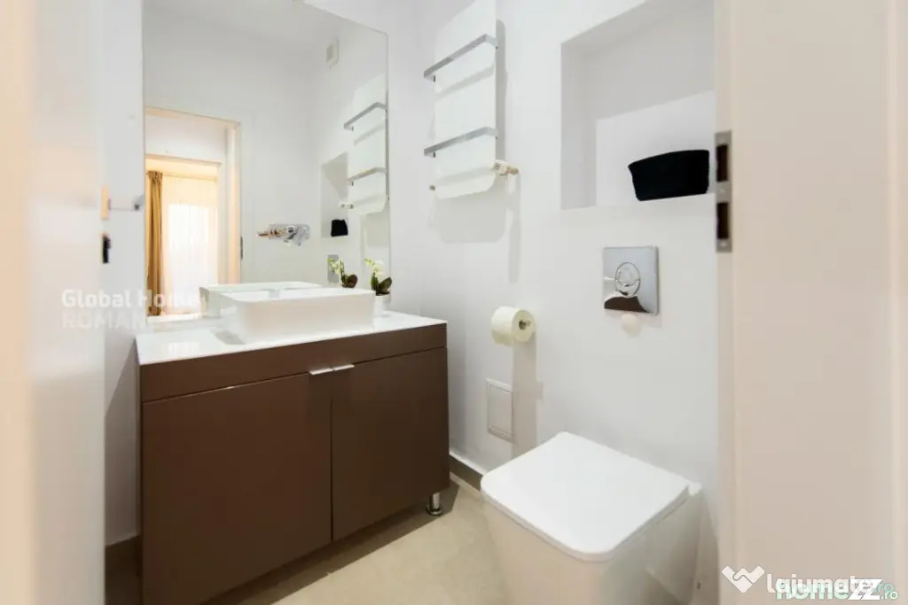 Dormitorul oferă un spațiu intim și confortabil, fiind complet mobilat și beneficiind de multiple spații de depozitare. Apartamentul dispune de două băi moderne, amenajate cu finisaje premium și obiecte sanitare de calitate.