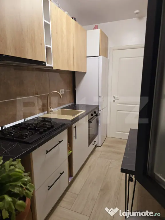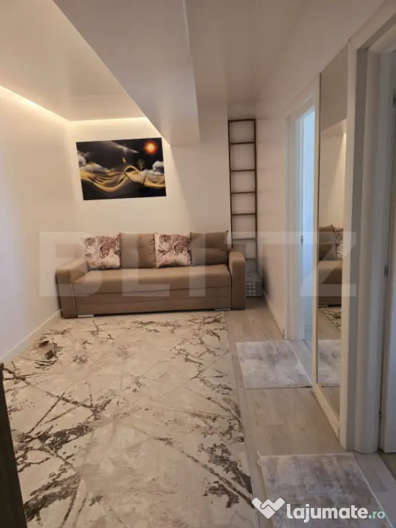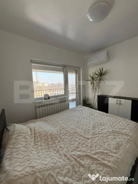 Compartimentarea este practică și funcțională și cuprinde: hol de acces, living luminos cu canapea extensibilă, TV, aer condiționat și șemineu decorativ, un dormitor elegant, o bucatarie practic nouă , baie cu geam și un balcon spațioas, de cca 10 mp– perfecte pentru relaxare și momente de liniște.
