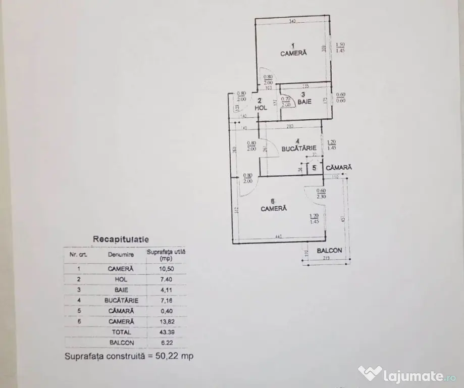Are suprafața utilă de 43,39 mp + suprafața balcon de 6,22 m, suprafața construită 50,22 mp, este prevăzut cu ușă antiefracție, acces controlat prin interfon, centrala termică, termopan, aer condiționat, gresie, faianță, parchet.