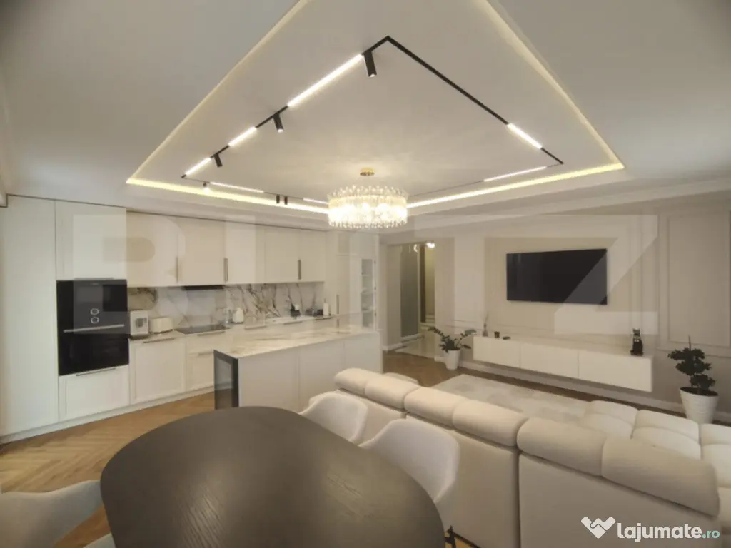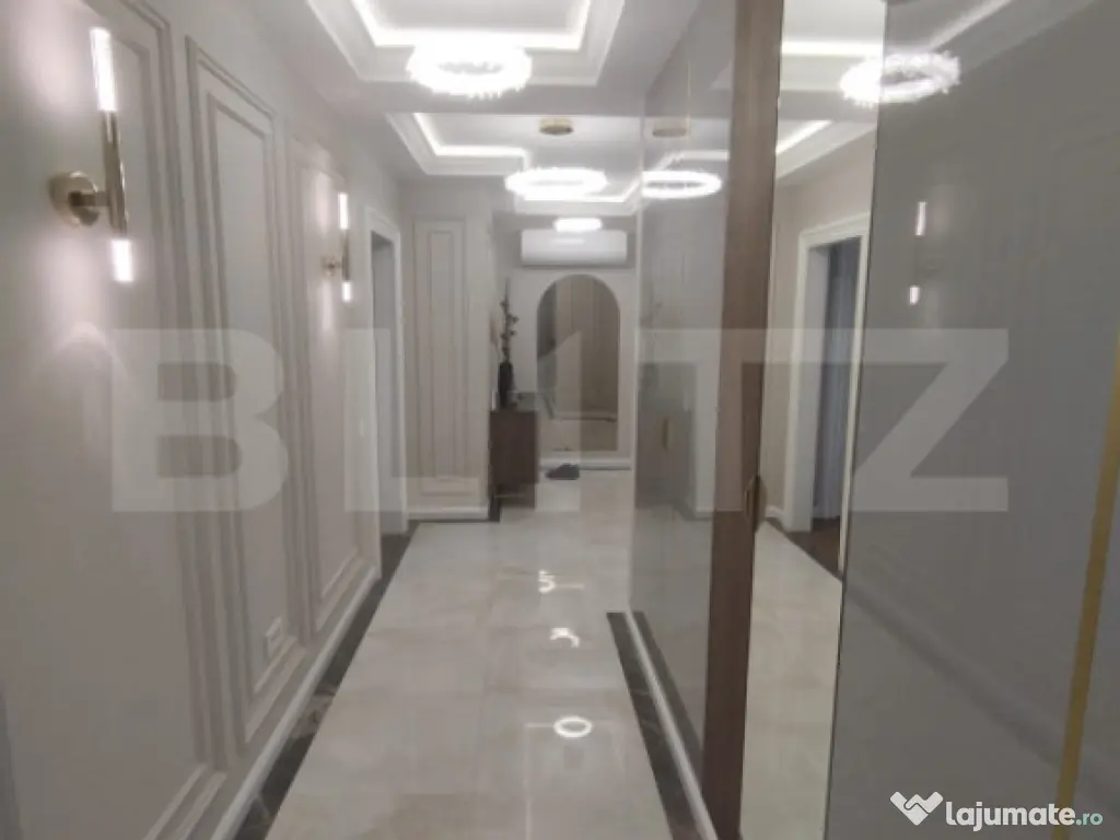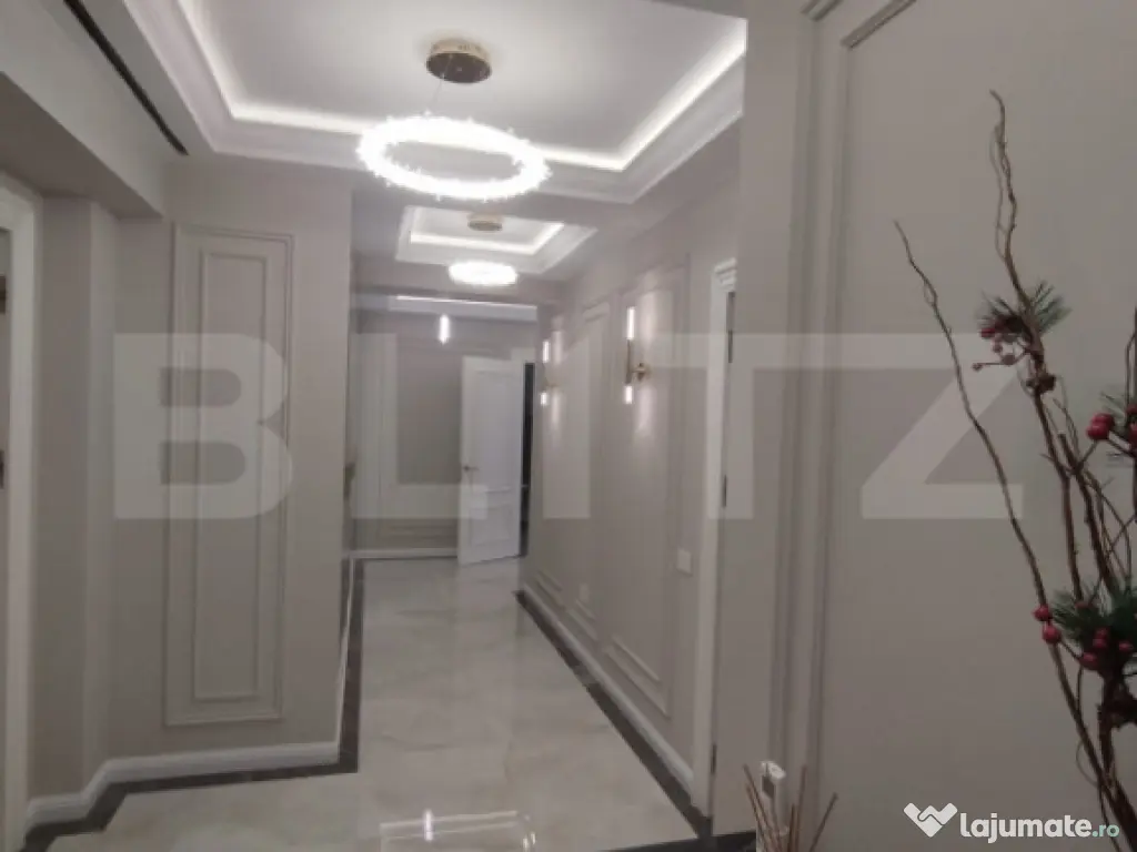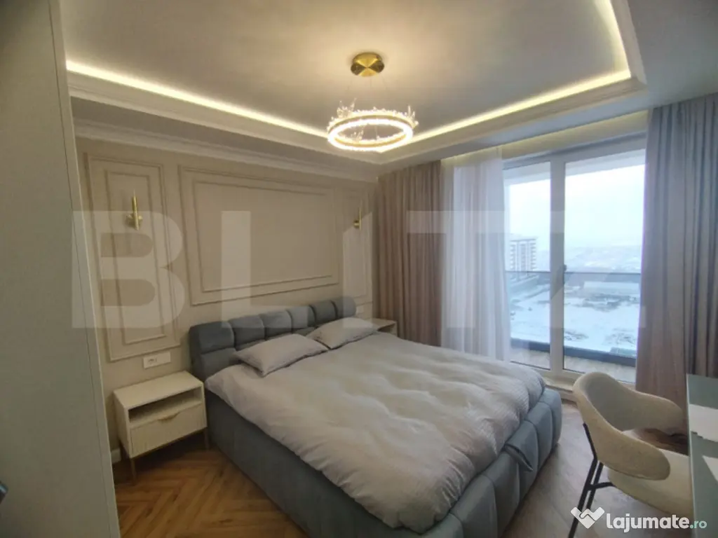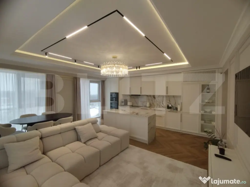 Blitz vă propune un apartament de lux cu 3 camere, având o suprafață generoasă de 100 mp și o priveliște panoramică spectaculoasă, ideal pentru cei care își doresc un stil de viață rafinat, într-un spațiu modern și perfect funcțional. Proprietatea se remarcă prin designul elegant, finisajele premium și atenția deosebită acordată fiecărui detaliu. Apartamentul este compartimentat eficient și oferă un living luminos, două dormitoare spațioase și două băi moderne, completate de un hol generos ce asigură o circulație armonioasă între încăperi. Mobilierul este realizat integral la comandă, fiind perfect adaptat spațiului, iar calitatea materialelor și a execuției reflectă standarde înalte de confort și estetică. Apartamentul este dotat cu obiecte sanitare de calitate superioară Hansgrohe și Villeroy & Boch, care asigură atât un design elegant, cât și durabilitate și confort sporit. În plus, proprietatea beneficiază de electrocasnice moderne incluse, printre care se numără mașina de spălat rufe, mașina de spălat vase, frigiderul, frigiderul pentru vinuri, precum și un sistem de aer condiționat dual inverter, cu funcții de răcire, încălzire și purificare a aerului, oferind un climat interior optim pe tot parcursul anului. Apartamentul beneficiază si de o stație de dedurizare a apei, oferind un plus de confort și calitate în utilizarea zilnică. Confortul este asigurat de încălzirea în pardoseală, împărțită în șase zone, fiecare dotată cu termostat individual, precum și de iluminatul ambiental atent ales, care pune în valoare detaliile de design, finisajele premium și paleta cromatică în tonuri calde. Ferestrele mari permit pătrunderea abundentă a luminii naturale și oferă o priveliște panoramică deosebită, contribuind la o atmosferă elegantă și primitoare. Acest apartament reprezintă o alegere ideală pentru cei care apreciază luxul discret, confortul absolut și funcționalitatea, fiind pregătit pentru mutare imediată. Cod ofertă / ID BLITZ: P161764 Id intern: P161764 Confort: 1 Tip imobil: Bloc de apartamente Număr Băi: 2