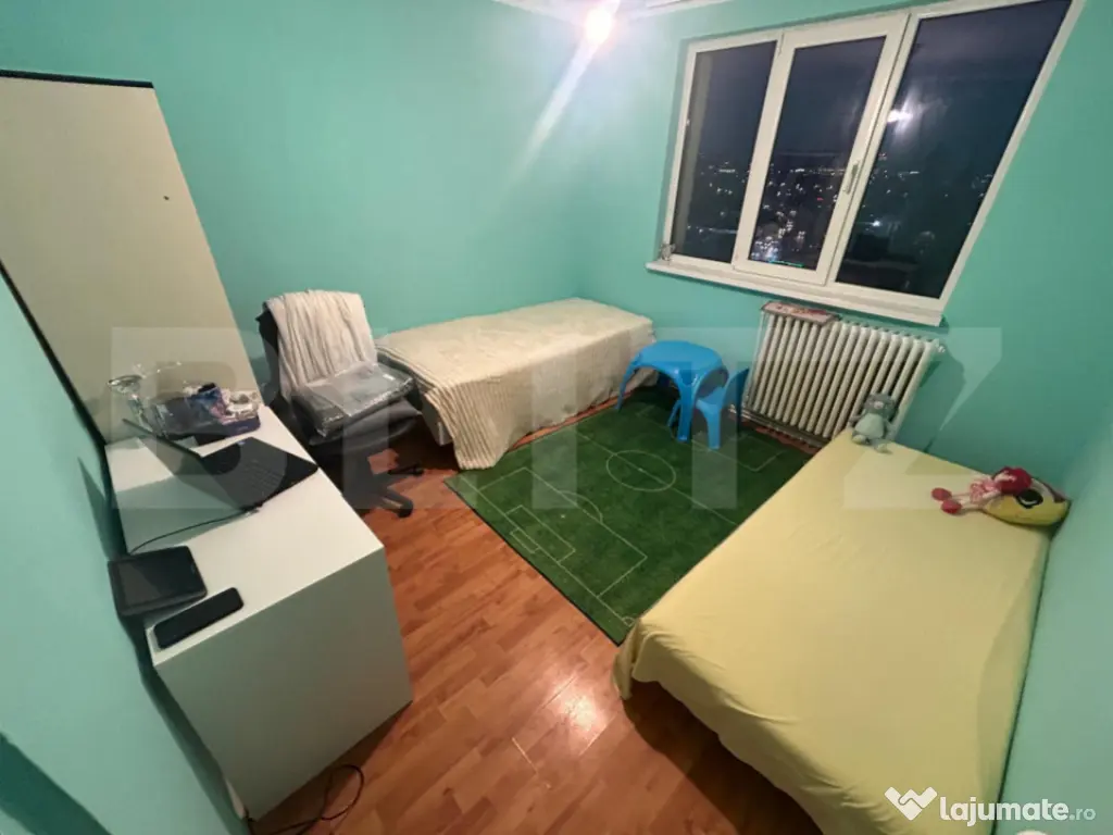 Blitz va propune un apartament cu 3 camere, situat la etajul 10 din 10, oferă o atmosferă luminoasă și modernă, beneficiind de o priveliște superbă asupra zonei. Cei 74 de metri pătrați sunt compartimentați inteligent, într-un open-space generos care unește bucătăria și livingul, completându-se cu două dormitoare confortabile și o baie spațioasă. Imobilul dispune de lift și este amplasat într-o zonă excelentă, cu acces rapid la toate facilitățile necesare: magazine, transport, școli, spații verzi și puncte de interes. Este o locuință ideală pentru cei care își doresc confort, lumină și o poziționare avantajoasă în oraș. Cod ofertă / ID BLITZ: P158650 Id intern: P158650 Confort: 1 Tip imobil: Bloc de apartamente Număr Băi: 1