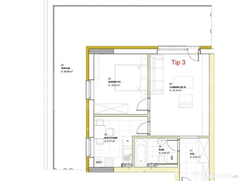Apartament cu 2 camere, 48.38 mp, terasa 38.98 mp, zona Loui