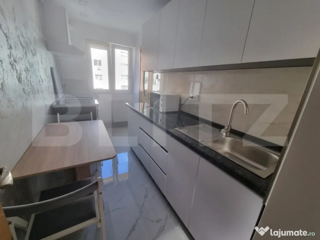 Blitz ofera spre inchiriere un apartament modern, mobilat si utilat complet. Apartamentul se află intr-una din cele mai căutate zone din oras, datorita accesului facil la mijloacele de transport în comun, facultati, magazine și alte facilitati necesare pentru un stil de viata confortabil. Apartamentul are o compartimentare decomandata, cu hol spațios la intrare, bucatarie separata, mobilata și dotata cu electrocasnice (aragaz, hota, frigider), baie, 2 camere (fiecare cu balcon). Apartamentul a fost renovat complet anul acesta și se afla la prima inchiriere. Alte dotari: usa metalica la intrare, geamuri termopan, centrala termica proprie, masina de spalat haine. Va asteptam la vizionare! Cod ofertă / ID BLITZ: P130245 Id intern: P130245 Confort: 1 Tip imobil: Bloc de apartamente Număr Băi: 1