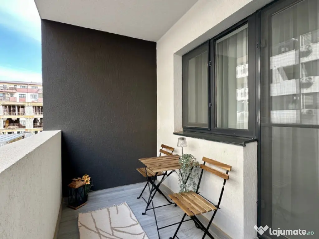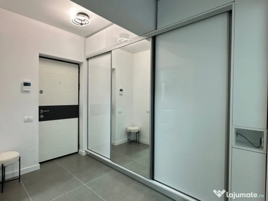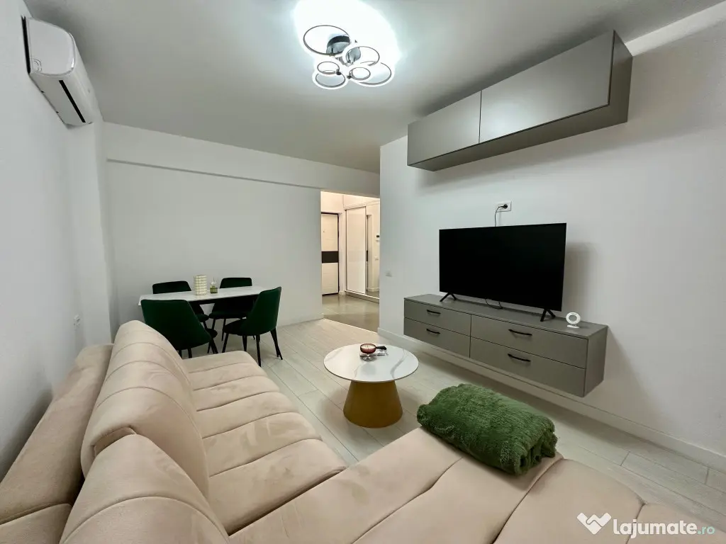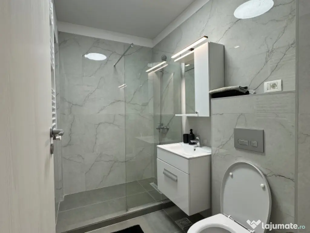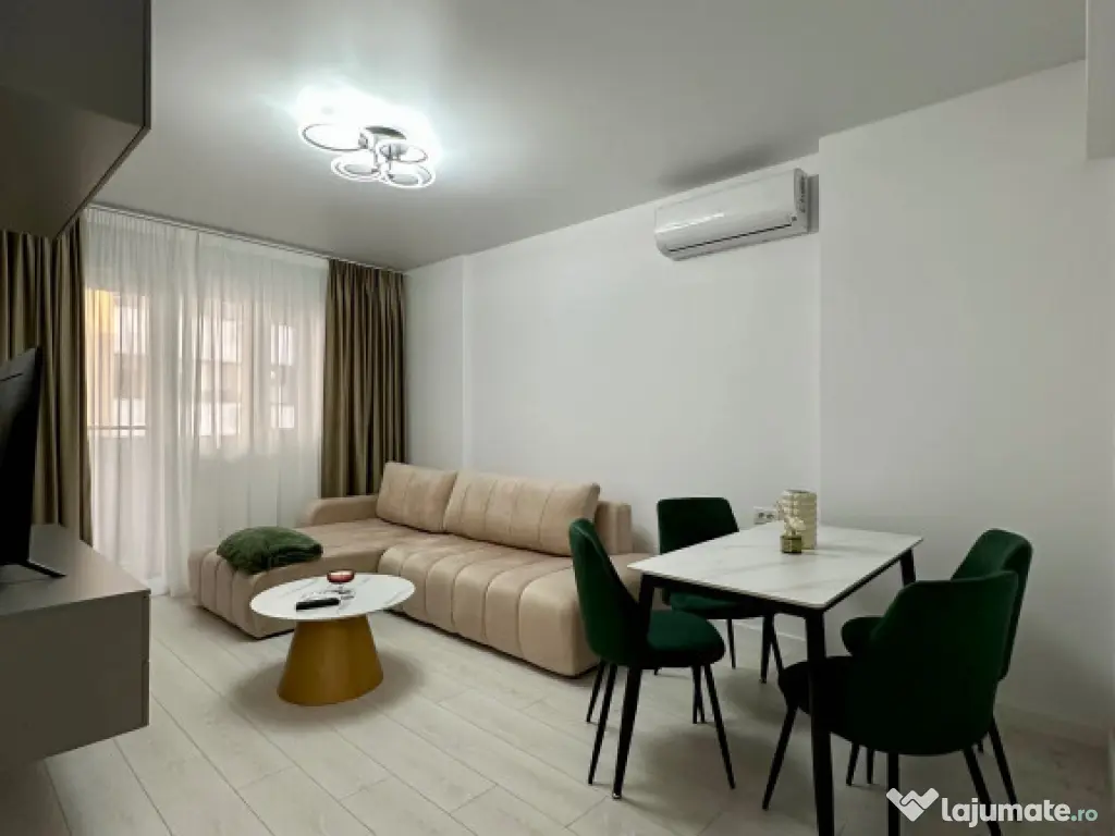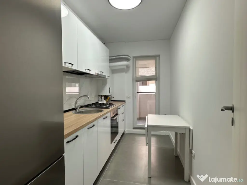 garsoniera situata in Popesti Leordeni, pe strada Biruintei la nr. 81. Imobilul este nou (finalizat ianuarie 2025). Garsoniera este pozitionata la etajul 2, al unui bloc S+P+7 (cu doua lifturi Schindler), are orientare Vest, este decomandata si este formata din camera de zi, bucatarie, baie si hol, toate insumand suprafata utila de 33 mp + balcon 6,8 mp = 39,8 mp utili. Blocul dispune de acces facil catre statia de metrou Berceni (5 min). Locuinta are centrala termica cu termostat de ambient, incalzire prin pardoseala, aer conditionat, video interfon, masina de spalat rufe, este complet mobilata si utilata (combina frigorifica Full no frost, plita, cuptor electric, TV smart 4K, hota). Complexul beneficiaza de bariere de acces, camere supraveghere, 2 piscine si un parc. Garsoniera se inchiriaza pentru prima data. Confort: 1 Tip imobil: Bloc de apartamente Comision cumpărător: 50%