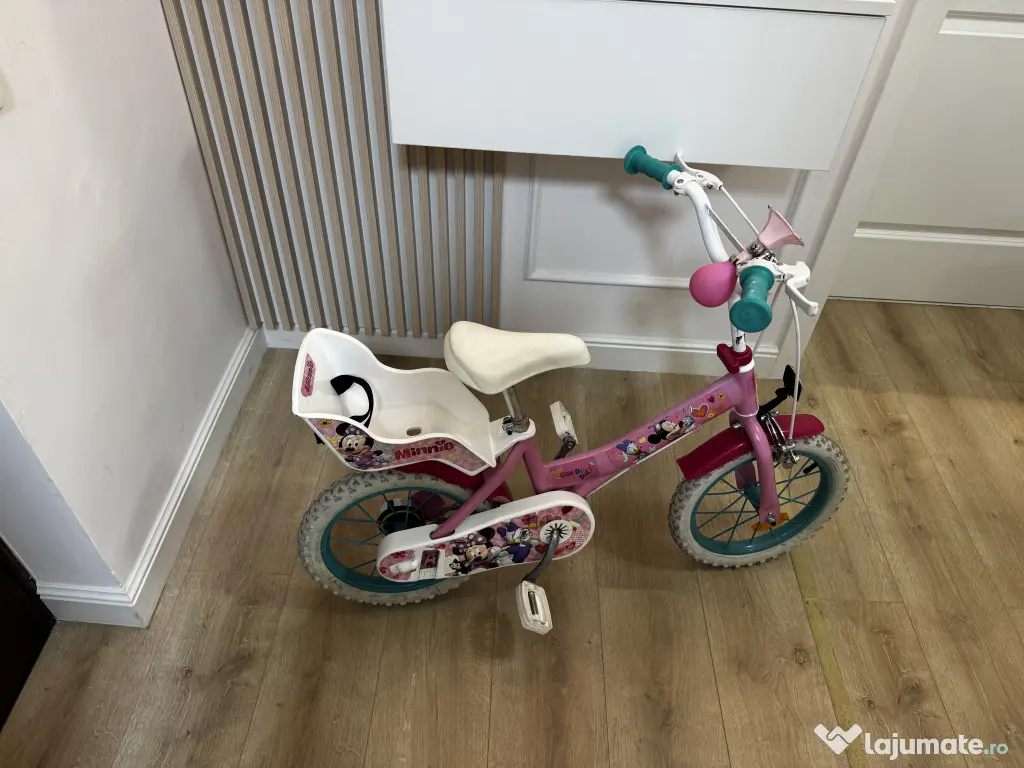 Vând bicicletă roz cu Minnie pentru fetițe (vârstă recomandată 3-6 ani), extrem de puțin utilizată și păstrată în stare impecabilă. Este modelul perfect pentru micile prințese care doresc să învețe mersul pe două roți într-un mod sigur și distractiv!