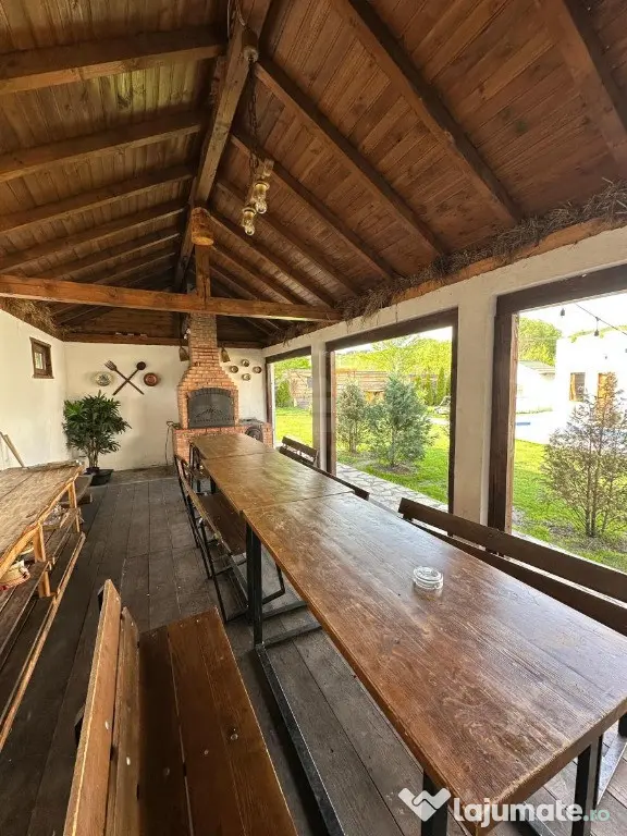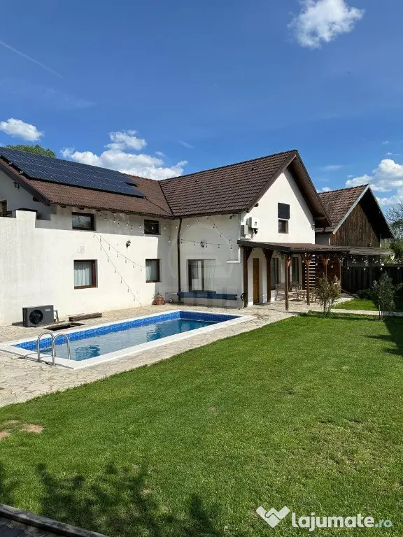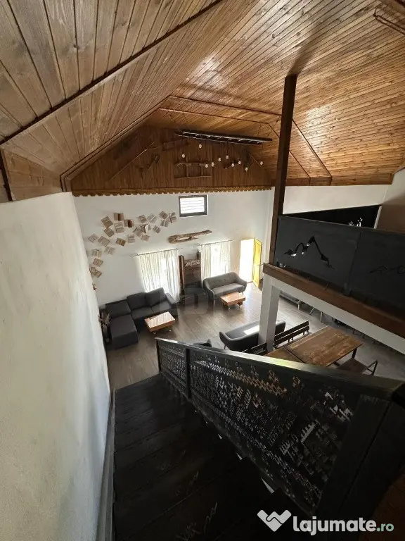 Imobilul dispune de 21 de locuri de cazare și este compartimentat pe două niveluri: la parter se găsește un living open space de aproximativ 100 mp, trei apartamente cu câte două camere și baie proprie fiecare, o bucătărie complet utilată de 30 mp, o terasă acoperită de 48 mp, piscină încălzită cu dimensiunile de 3 x 7 m și jacuzzi electric. La etaj sunt amenajate cinci camere duble, fiecare cu baie proprie și acces la o terasă interioară, ceea ce asigură confort și intimitate pentru oaspeți. În total, cabana dispune de 12 camere și 9 băi moderne, toate mobilate și utilate complet, cu finisaje de calitate: faianță, gresie și parchet laminat.