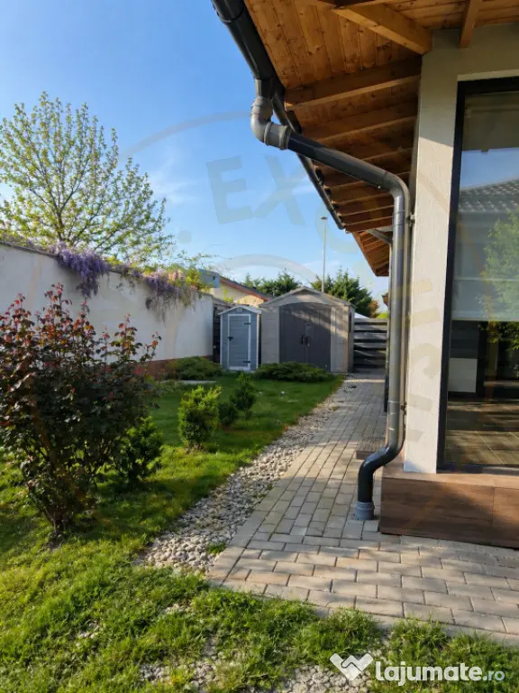 Terenul de 450 mp oferă spațiu real, bine organizat, amenajat cu gazon, flori, pomi și zonă pentru relaxare, căsuță pentru depozitarea uneltelor de grădină, iar cele 3 locuri de parcare sunt un avantaj clar, mai ales pentru o familie.