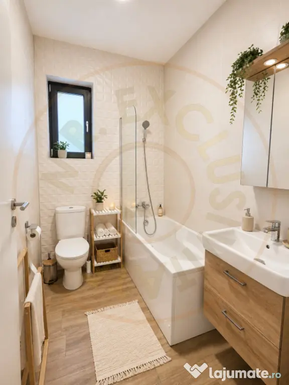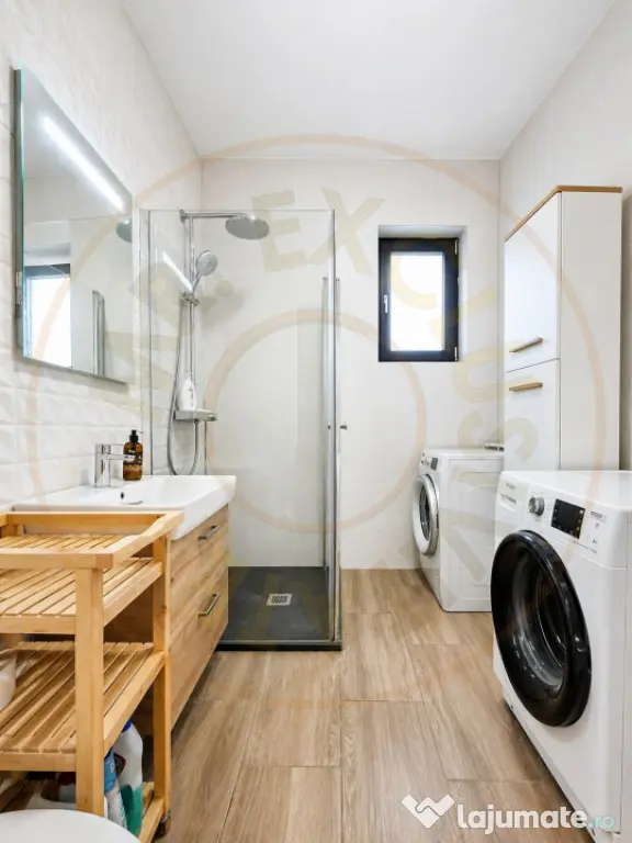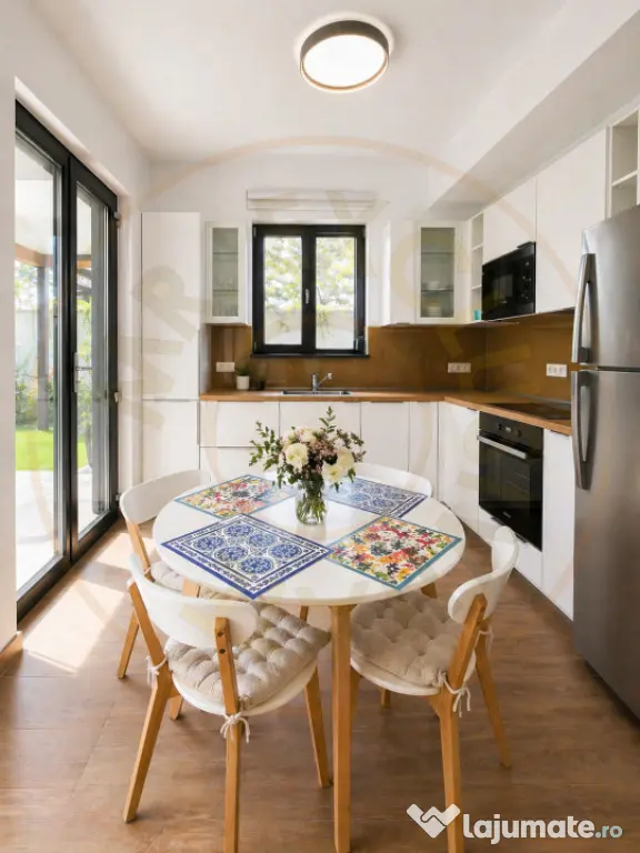 Momentan este parțial mobilată, cu dulapuri în toate camerele, existând posibilitatea de completare în funcție de nevoile viitorului chiriaș. Bucătăria și băile sunt complet utilate și echipate (plită cu inducție, cuptor electric, cuptor cu microunde, hotă, mașină de spălat vase, frigider, mașină de spălat rufe și uscător). Toate ferestrele sunt prevăzute cu rulouri exterioare, care limitează pătrunderea luminii puternice și contribuie la menținerea unei atmosfere plăcute în interior. Beneficiezi de toate dotările esențiale: încălzire în pardoseală, centrală pe gaz și aer condiționat.