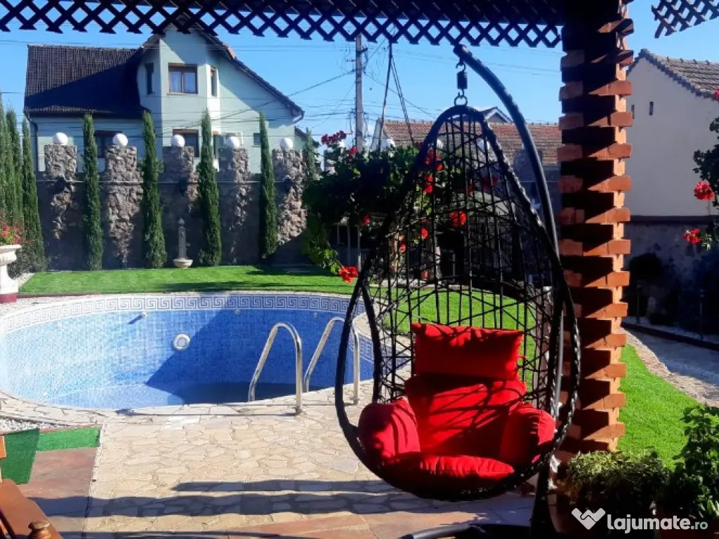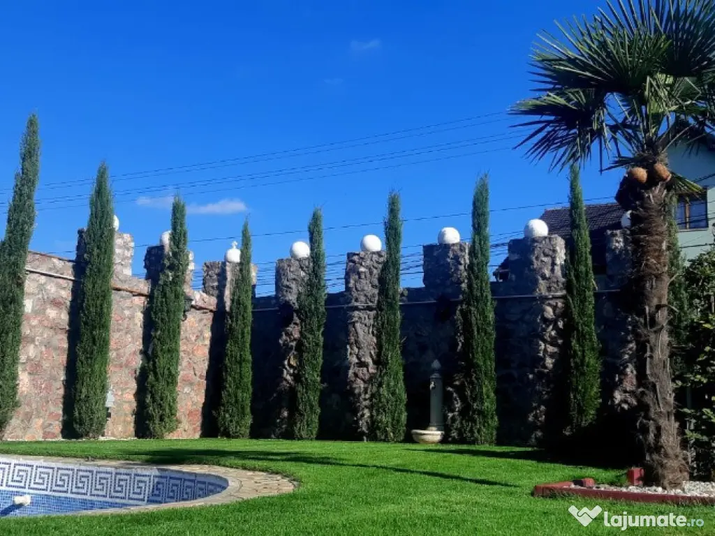Vand casa in Arad, zona Gradiste, casa cu teren in suprafata de 764 mp, D+P+M, 5 camere, 5 bai, bucatarie, camara alimente, 3 dressing-uri, pod, garaj, sauna si cabina de dus la demisol, bucatarie de vara, suprafata construita 585 mp, din care 80 mp la demisol: sauna, garaj, depozit, 247 mp la parter: sufragerie cu semineu, 2 dormitoare cu 2 dressinguri si 2 bai, bucatarie, si 258 mp la mansarda: 2 dormitoare, 2 dressinguri si 2 bai, incalzire centrala pe gaz si lemne, la parter in pardosea, la mansarda in calorifere, aer conditionat prin tubulatura in toata casa, piscina in curte. Pret : 399.000 euro ID : RH-6989-property