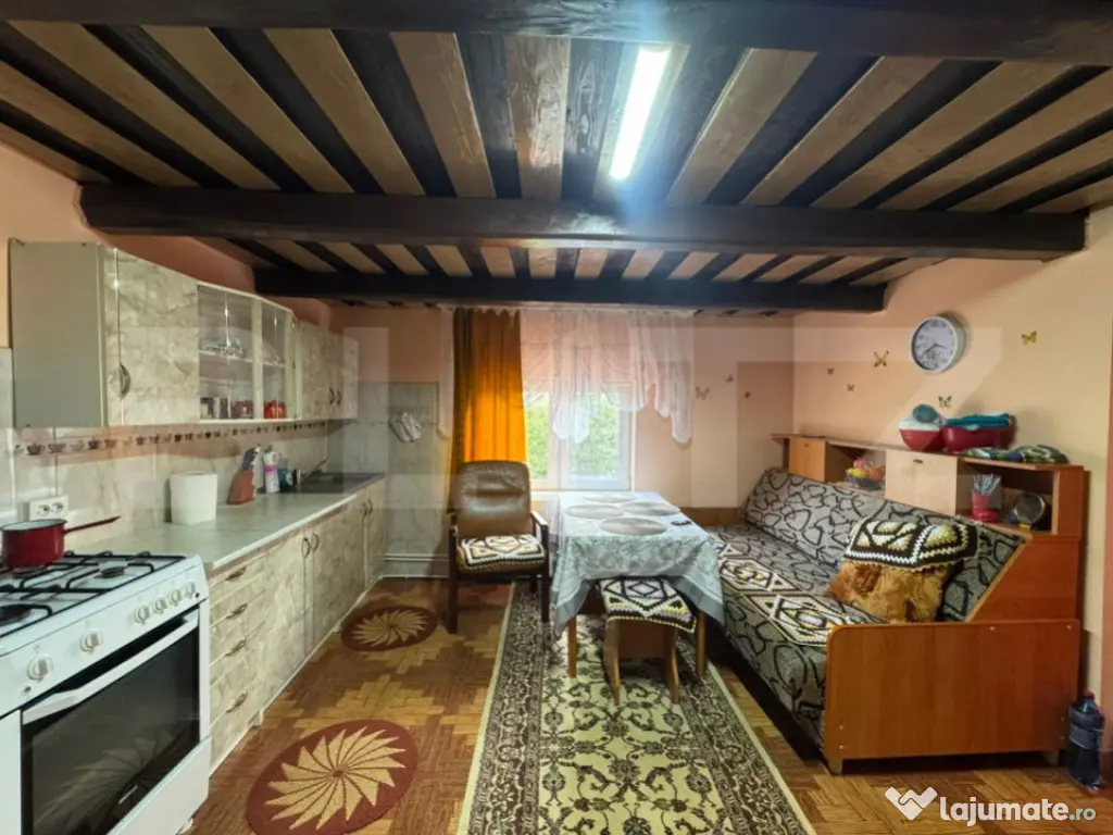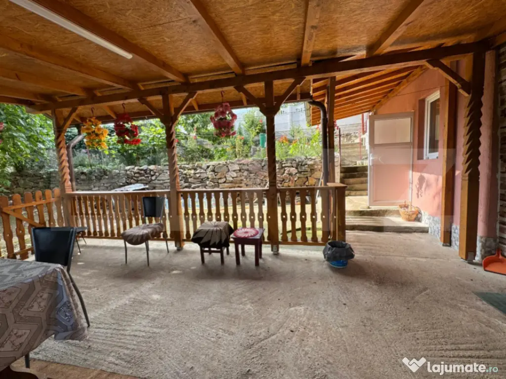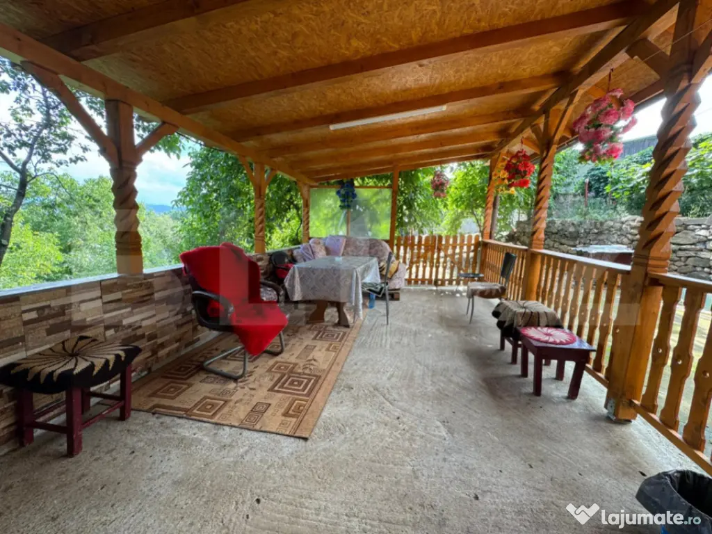 Blitz va propune o casă cochetă situată în localitatea Ghelari, într-o zonă deosebit de liniștită, cu aer curat și o priveliste panoramică superbă asupra naturii — locul ideal pentru relaxare sau locuit permanent. Caracteristici principale: Suprafață construită: 70 mp Teren generos: 9.000 mp Construcție din lemn, renovată complet în 2018 Izolație exterioară completă Acoperiș nou (înlocuit integral în 2018) Instalație electrică și sanitară refăcute Compartimentare: Demisol: Cameră tehnică Magazie pentru lemne Beci Bucătărie de vară Terasă spațioasă Parter: 2 dormitoare Living luminos Hol Baie Terasă cu vedere panoramică Sistem de încălzire: Centrală pe lemne Sobe de teracotă, pentru un plus de confort și căldură autentică Puncte forte: Cadru natural superb Liniște deplină, perfect pentru relaxare sau refugiu de vacanță Teren ideal pentru grădinărit, livadă sau alte activități gospodărești Pentru mai multe detalii și programări la vizionare, nu ezitați să mă contactați! Cod ofertă / ID BLITZ: P153004 Id intern: P153004 Număr Băi: 1 Curent Apă Canalizare