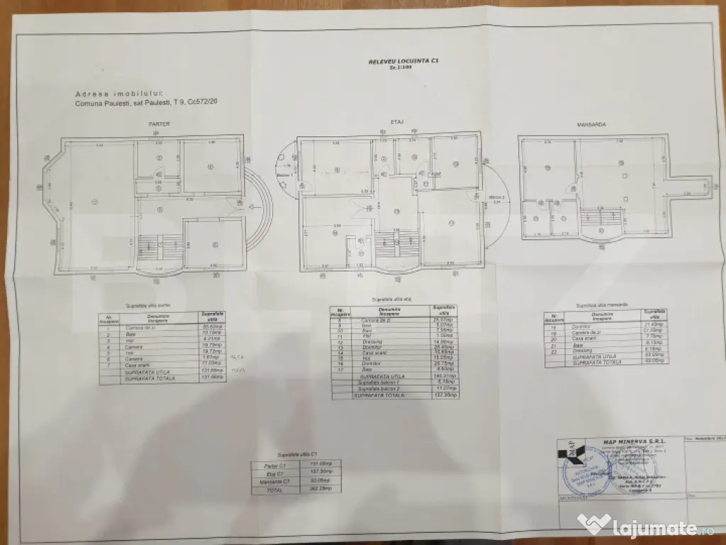 Blitz oferă spre vânzare proprietate deosebită situată în Păulești, ideală pentru locuință de familie sau investiție.Locuinta are 8 camere,cu o suprafață utilă de 410 mp și teren de 1000 mp, cu deschidere de 15 ml.Construită în 2008, locuința nu a fost locuită, fiind realizată cu materiale premium și deosebita atenție la detalii. Caracteristici construcție : >structură solidă din cadru de beton și BCA >pereți tencuiți și izolație exterioară cu polistiren de 10 cm +izolatie interioara cu vată minerală 5 cm >acoperiș din tablă zincată cu rocă vulcanică – garanție pe viață >ferestre tripan >apele pluviale sunt conectate la reteaua de canalizare Interior: >ușă la intrare din stejar >casa scării din lemn de fag si iluminat cu senzori de mișcare >finisaje premium: gresie și faianță porțelanată, obiecte sanitare și robineți de calitate >4 dormitoare cu baie proprie >2 balcoane Compartimentare Parter: >bucătărie >living open-space cu dining >birou >baie Etaj: >2 dormitoare, fiecare cu baie proprie si dressing >1 dormitor cu baie proprie Mansardă: >open-space generos >dormitor cu baie și dressing Curte amenajată complet: >beton amprentat >gazon cu sistem de irigare >sistem de iluminat exterior >canalizare cu gură de verificare >foișor complet utilat: apă, gaze, electricitate, baie proprie, ușă culisantă și geamuri tripan Proprietatea oferă spațiu generos, confort și multiple posibilități de utilizare, fiind potrivită atât pentru locuință exclusivistă, cât și pentru activități turistice sau business. Pentru mai multe informații sau programarea unei vizionări, vă stăm la dispoziție. Cod ofertă / ID BLITZ: P167027 Id intern: P167027 Număr niveluri imobil: 2 Număr Băi: 5 Nr. locuri parcare: 3 Curent Apă Canalizare Sistem irigaţie