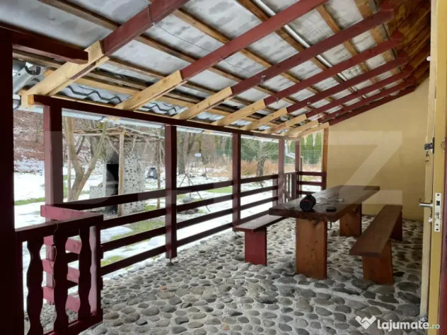 Proprietatea este amplasată pe un teren generos de 2460 mp, oferind posibilitatea construirii mai multor cabane sau amenajării unui spațiu de relaxare extins.