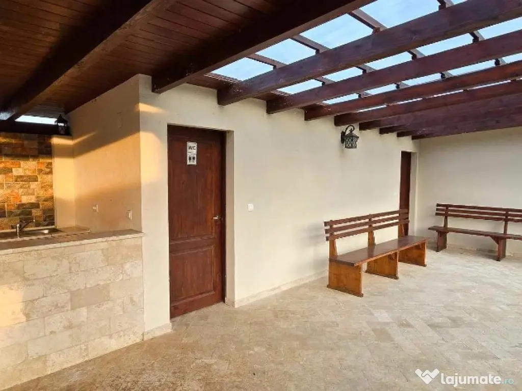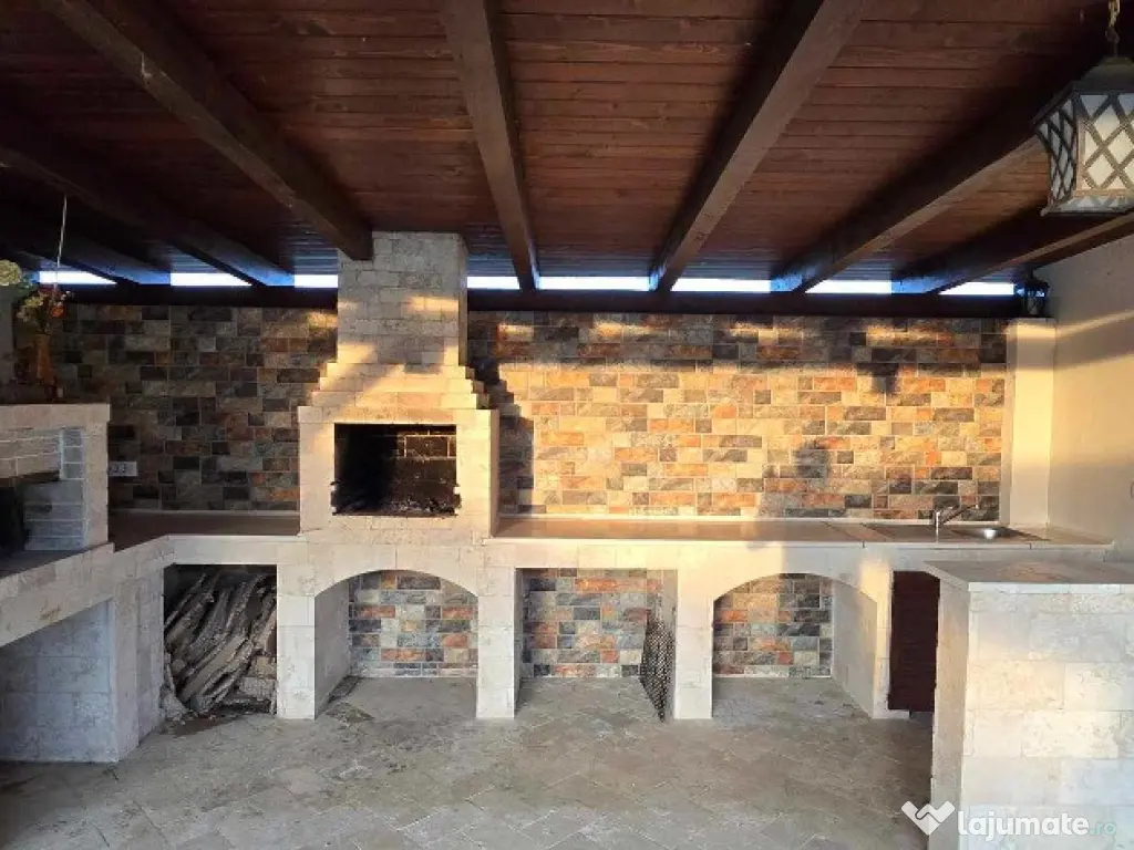 Suprafața terenului este una generoasa de 970 mp, front stradal generos ,intrare auto, poarta cu deschidere automată,casa principală cu o suprafața desfășurată mare și un alt corp anexa cu destinația zonă de relaxare,filigorie,garaj. Suprafața construită a casei este de aproximativ 300 mp, iar suprafața utilă de 240 mp,corpul principal al casei, totodata mai regăsim un corp secundar în suprafață de aproximativ 80 mp utili. În curte mai exact la limita de proprietate se află zona de relaxare a casei, garaj, filigorie cu zona de bucatarie și loc de luat masa în exterior, de asemenea anexa la aceasta, cămara pentru alimente, iar în spatele acestei cladiri anexa de depozitare, fântana,garaj cu poartă automată.