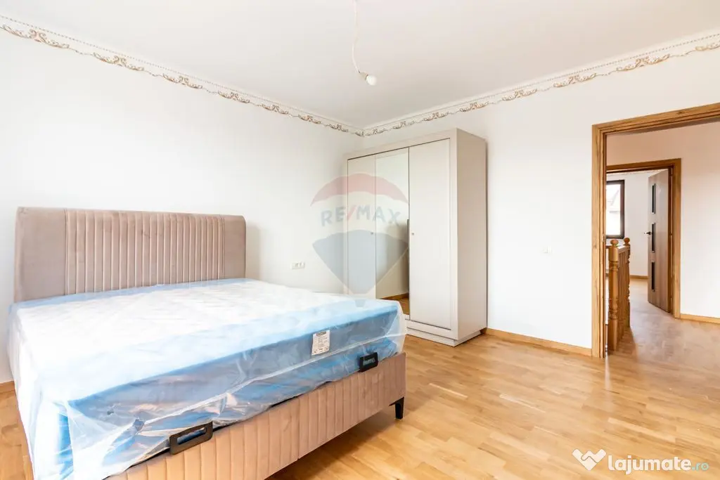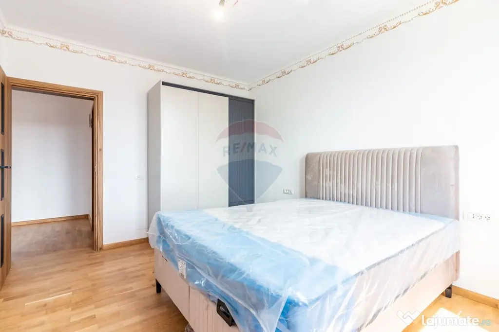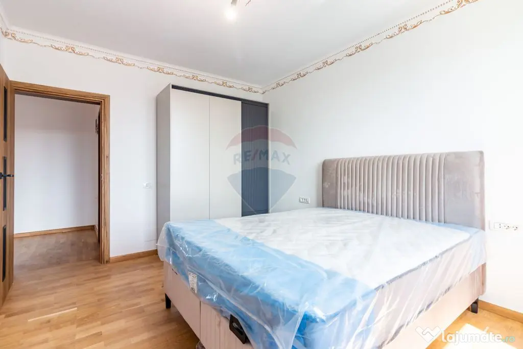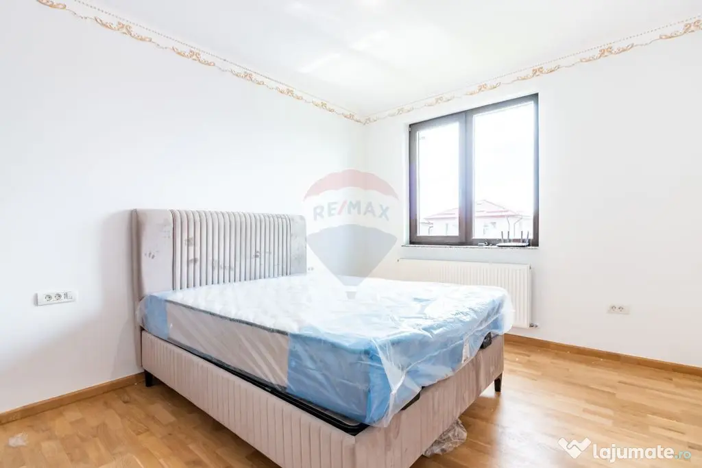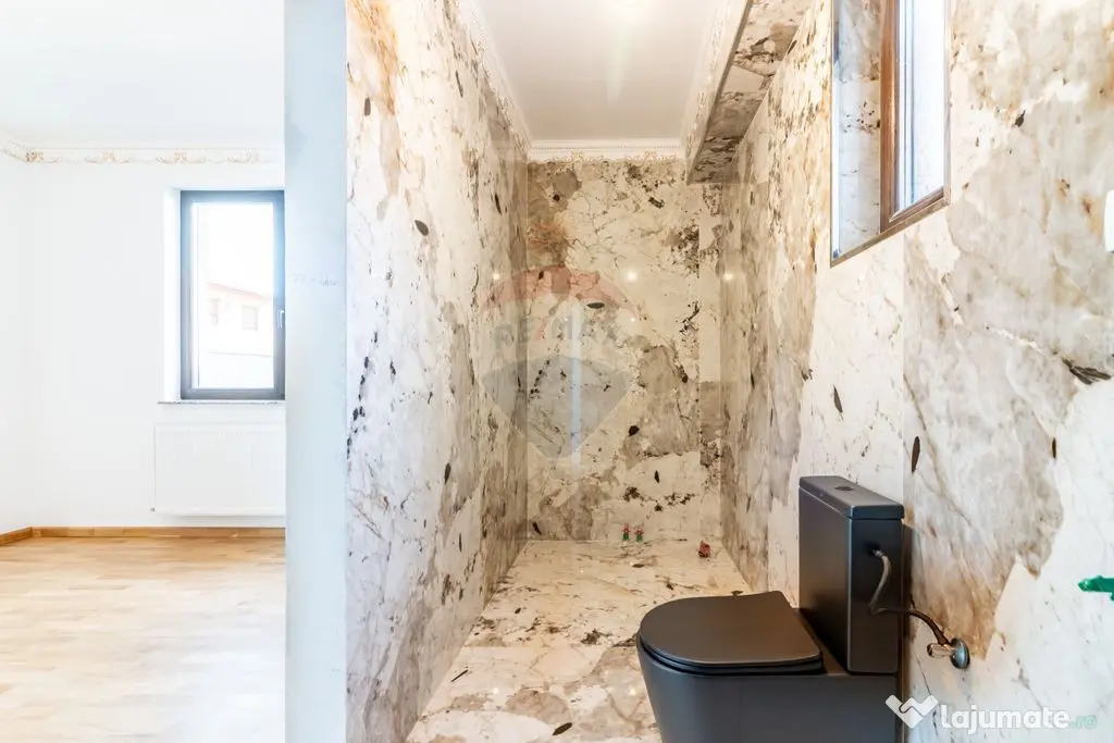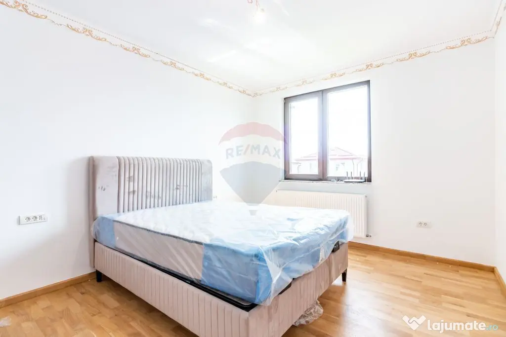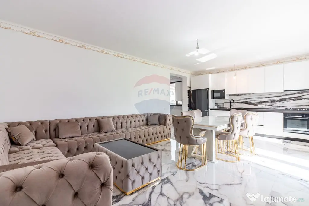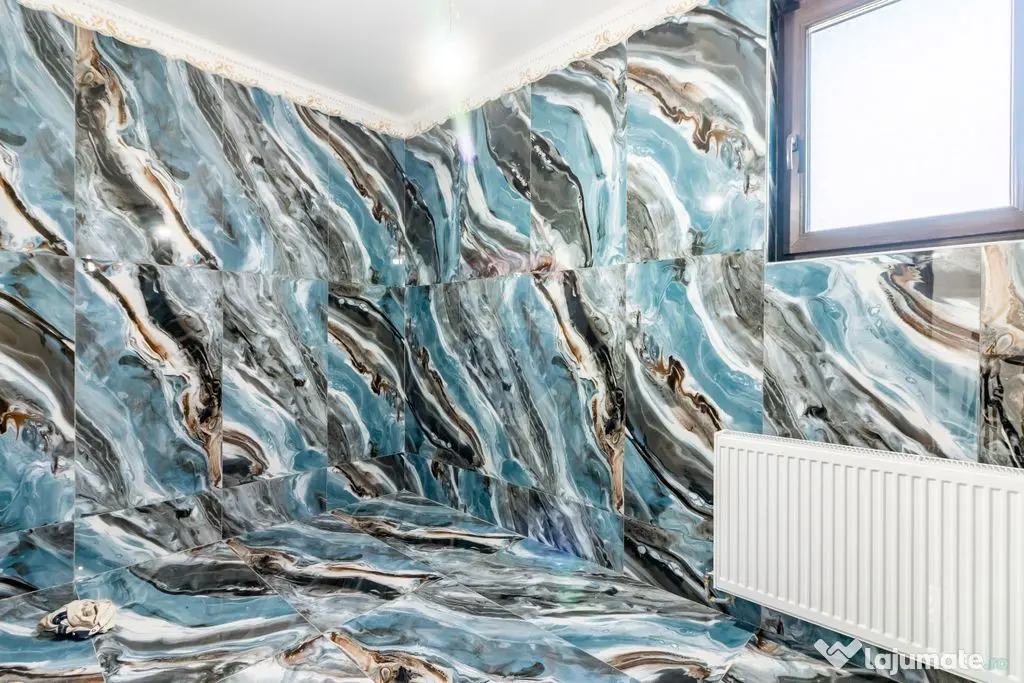 Finisajele sunt de calitate superioară, cu accent pe eleganță și durabilitate, regăsindu-se gresie tip marmură, detalii decorative fine și mobilier modern inclus parțial în preț. Bucătăria este echipată cu electrocasnice, iar întreaga locuință este pregătită pentru utilizare imediată. Confortul termic este asigurat de o centrală proprie în condensare și sistem de încălzire cu calorifere, iar tâmplăria PVC cu geam termopan contribuie la eficiența energetică și la izolarea fonică.