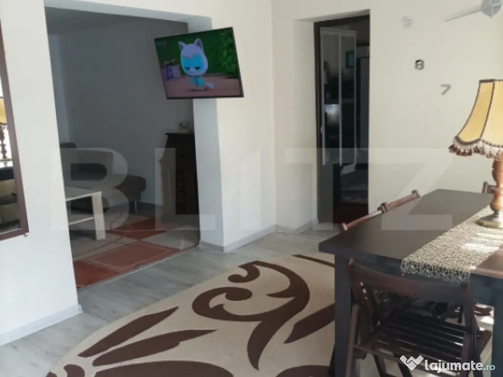 BLITZ va prezinta o casa pe parter, aproximativ 140 mp, 3 dormitoare, o baie, o bucătărie, 2 camere depozitare, living open space! Centrala pe lemne, apa sursa proprie (este și ce-a de la oraș la poarta) curent, internet, aer condiționat! Drum asfaltat, in apropiere este statie de autobuz, magazin ,biserica! Zonă liniștită în care îți poți menține zona ta privată! Teren drept 828 mp, terenul se află și o sura/magazie mare foarte buna! Casa este parțial mobilat, utilată! Este formata din 2 constructii una nouă alipită de una mai veche dar de o rezistenta sporita! Va asteptam la vizionare! Cod ofertă / ID BLITZ: P150398 Id intern: P150398 Număr Băi: 1 Curent Apă Canalizare Climă