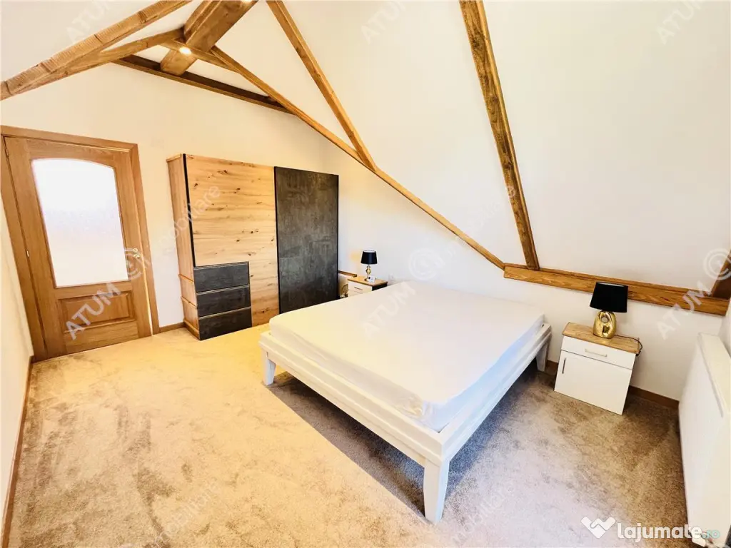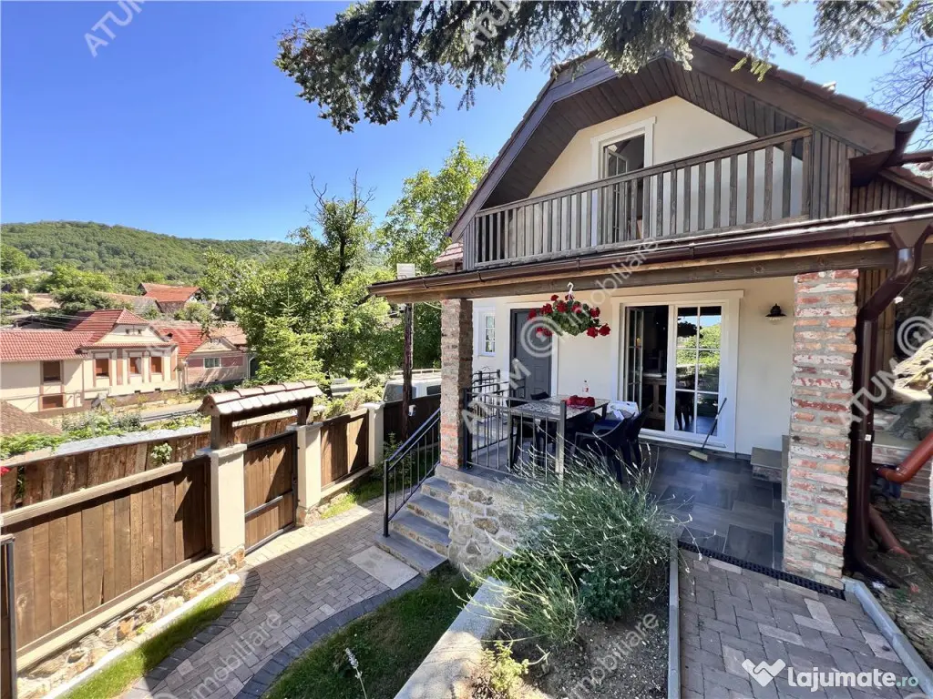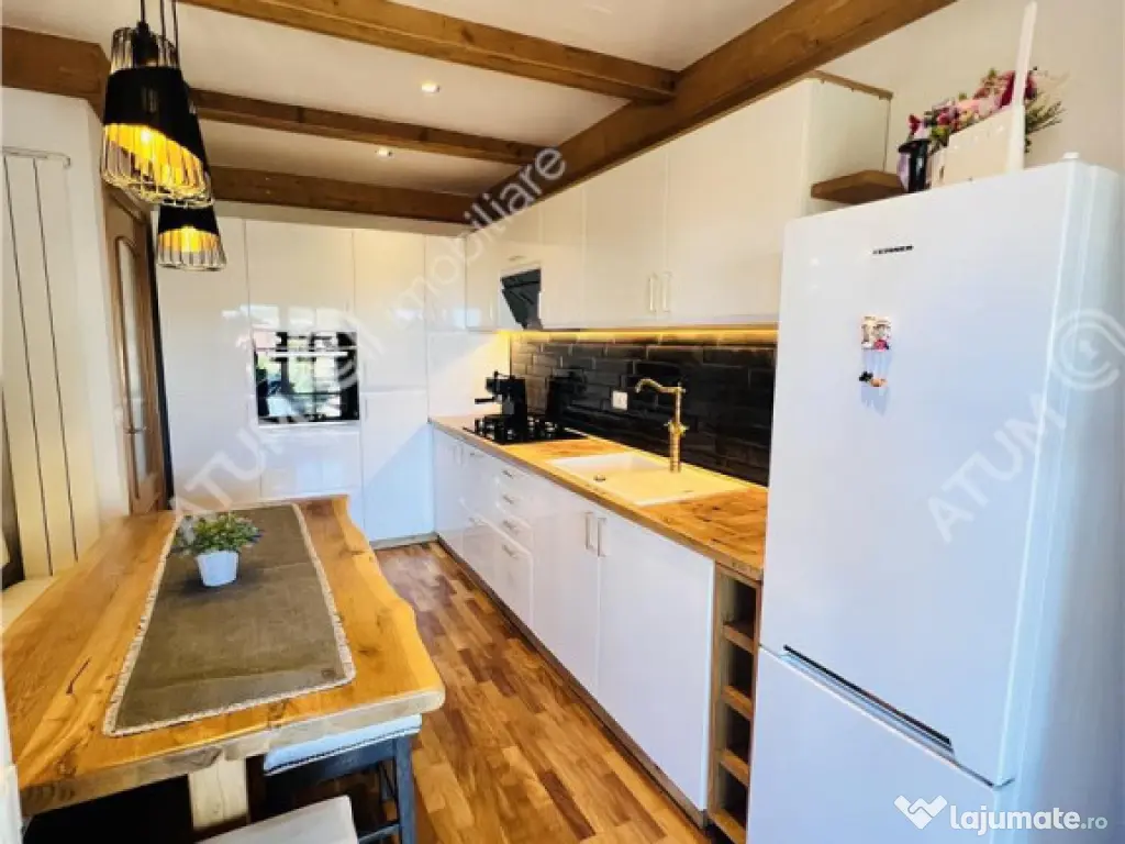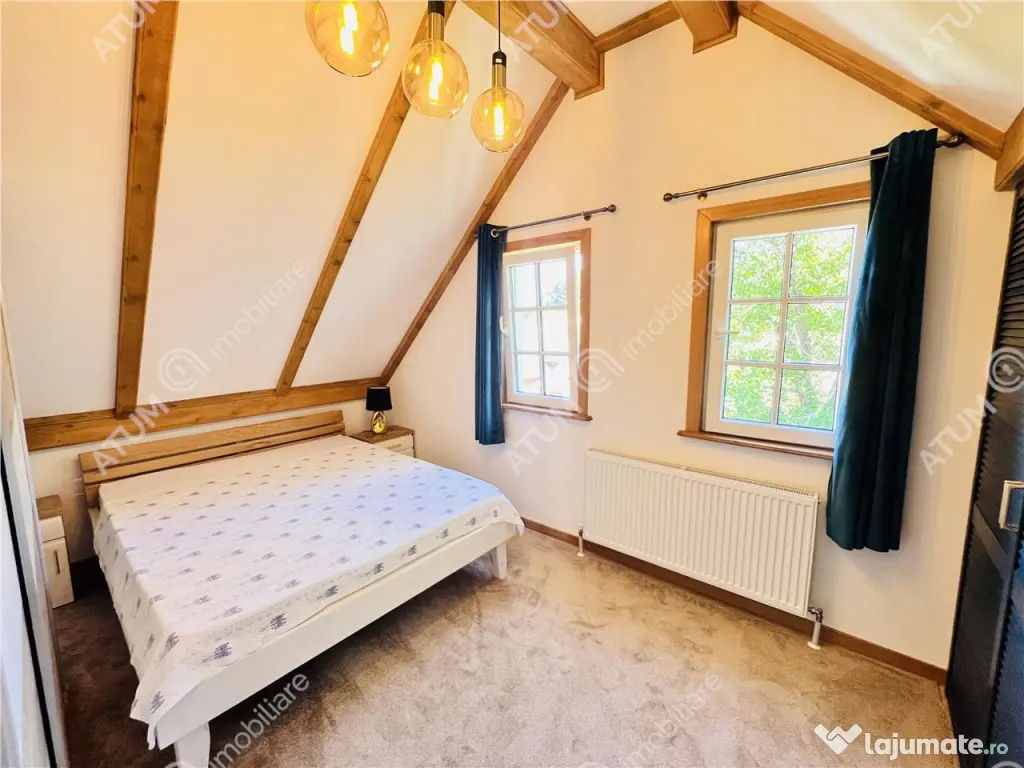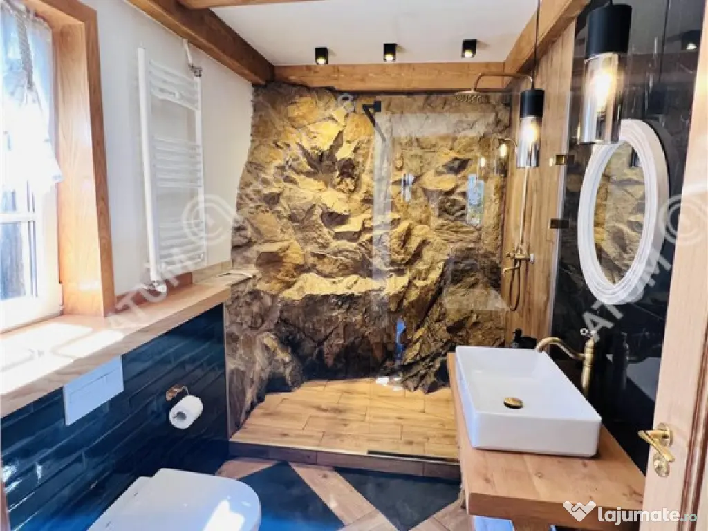 De vanzare casa individuala in Sibiel cu 3 camere, 2 bai, terasa, balcon, pivnita, amplasata pe un teren de aproximativ 176 mp. Constructia este noua de aproximativ 75 mp utili distribuiti pe parter si etaj, cu zidarie din caramida porotherm, izolata la exterior cu vata bazaltica, cu acoperis de tigla izolat cu vata bazaltica de 30. Compartimentarea este decomandata, la parter avand un hol dotat cu pantofar si cuier, livingul, bucataria si baia. La etaj suprafata este impartita in 2 camere dintre care una avand dressing propriu si o baie. Separat de suprafata utila, imobilul dispune de o terasa de 8 mp cu priveliste asupra satului turistic, un balcon, un beci si un spatiu pentru depozitare lemne. Curtea este amenajata peisagistic, terasata, cu banci si zona de gratar, jardiniere pentru plante, zone verzi, gradina. Locuinta a fost construita cu materiale de calitate precum podele din lemn masiv, tamplarie PVC, usi interioare premium din lemn, scara interioara de lemn. Baile sunt echipate cu obiecte sanitare, cea de jos este amenajata cu cabina de dus unde peretele stancii este integrat in constructie, iar baia de sus este dotata cu cada. bucataria este complet mobilata si echipata cu electrocasnice. Incalzirea imobilului se face cu centrala termica pe gaz, dar si cu semineu pe lemne. Proprietatea dispune de iluminat in curte si in fata portii cu panouri solare, supraveghere video si sistem de alarma. Locuinta se preda la cheie, gata de locuit sau de achizitionat ca investitie datorita localizarii acesteia intr-o zona foarte des frecventata turistic. Valoarea de achizitie a acesteia este de 190.000 euro. ID intern: 2787. Număr Băi: 2 Curent Apă Canalizare Gaz