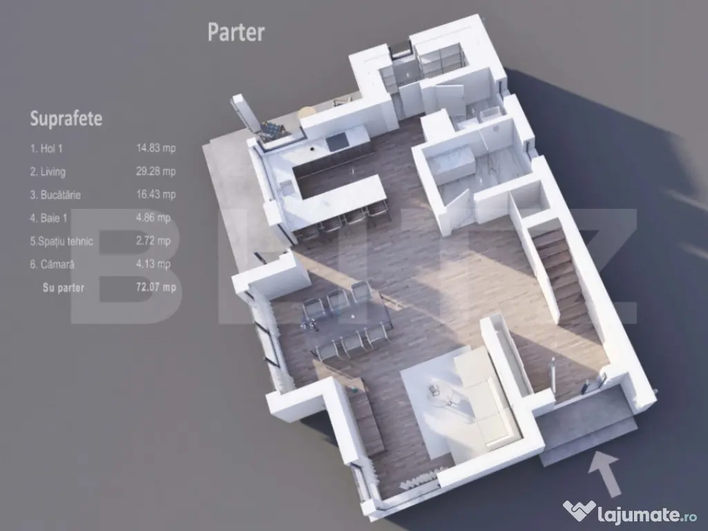 Blitz oferă spre vânzare casă individuală, amplasată pe un teren generos de 400 mp, cu o suprafață utilă de 138 mp, compartimentată eficient pentru confortul unei familii. Imobilul este dispus pe parter + etaj și este compartimentat astfel: Parter: living spațios și luminos bucătărie baie cămară spațiu tehnic Etaj: 3 dormitoare dormitor matrimonial cu baie proprie, dressing și ieșire pe terasă încă o baie pentru celelalte dormitoare Casa oferă un spațiu bine organizat, luminos și funcțional, ideal pentru o familie care își dorește confort, intimitate și curte proprie. Terenul de 400 mp oferă suficient spațiu pentru amenajarea unei grădini, zone de relaxare sau locuri de parcare. Pentru mai multe detalii sau programarea unei vizionări, nu ezitați să ne contactați. Cod ofertă / ID BLITZ: P166255 Id intern: P166255 Număr niveluri imobil: 2 Număr Băi: 3 Curent Apă Canalizare Gaz