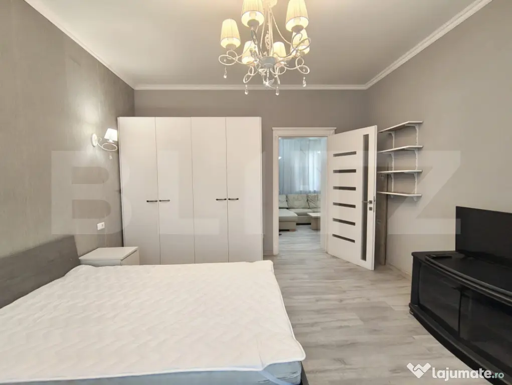 Ambele dormitoare sunt dotate cu dulapuri tip dressing, oferind spatii generoase de depozitare. Baia beneficiaza de geam pentru aerisire naturala si este dotata cu vana. Locuinta este echipata cu aer conditionat si trei televizoare, cate unul in living si in fiecare dormitor.