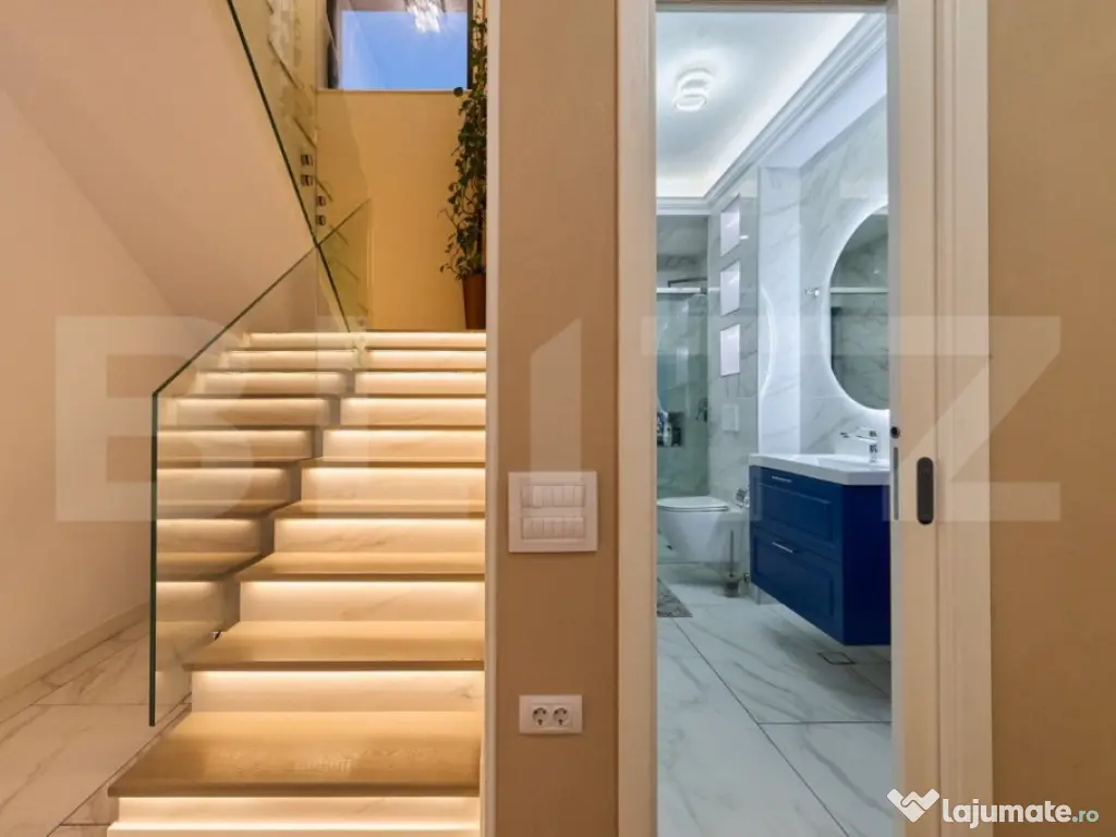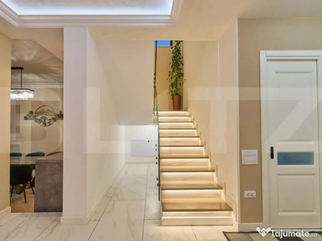 Vila de LUX - UNICAT! Finalizata Interior + Exterior ! PISCINA Exterior ! Localizata in Bucium. Se vinde complet utilata si mobilata - inclusiv electrocasnice. Vila este racordata toate utilitatile : energie electrica trifazic, gaz, canalizare, internet fibra optica. Accesul se face din strada asfaltata. Vila are o suprafata utila de 280 mp, 613 mp teren. Compartimentarea include pe parter 1 hol, 1 scara interioara, 1 living 25 mp cu 1 zona de dining 35 mp, 1 Bucatarie inchisa 20 mp, 1 Birou 20 mp, 1 Camera tehnica 8 mp 1 Baie de 6 mp si 1 terasa spatioasa de 60 mp. La Etaj avem 1 Hol, 1 Scara interioara 15 mp, 1 Baie 6 mp, Dormitor 1 de 16 mp, Dormitor 2 de 16 mp, 1 Dormitor Matrimonial cu 1 Dressing 25 mp și 1 Baie Matrimoniala 8 mp, 1 Balcon 20 mp, 1 Mansarda 60 mp. Terenul are o suprafata totala de 613 mp. Vila a fost realizat cu materiale de constructii si finisaje de cea mai buna calitate . La exterior structura de rezistenta este realizata pe cadre din beton armat si caramida * termoizolatie din polistiren EPS 100 15 cm, tamplarie clasa A - VEKA - antracit, Feronerie Maco Multimatic - cu sticla termopan pachet 3 sticle - 52 mm pervazuta cu bagheta Thermix anticondens * acoperita cu tigla Bramac * tencuiala decorativa exterior cu silicon-silicat si fibre * terase si aleei placate cu gresie antialunecare de trafic grosime 20 mm, 1 gard exterior realizat din stalpi de beton 25x25 cm cu fundatie din beton , lemn, 1 balustrada exterior din sticla securiza 828 si profil aluminiu * iluminat arhitectural cu banda led si proiectoare led- senzor de miscare * sistem de monitorizare cu camere HD - 10 buc * sistem video-interfon cu 2 monitoare la interior parter si etaj * parcare acoperita , 3 locuri cu posibilitatea instalare statie de incarcare masini electronice - trifazic * gazon + sistem de irigatie* etc. La Interior : Usi interior lemn stratificat Frasin , culisante in perete cu sistem italian Eclisse Parchet triplu Lemn Stratificat 14 mm - montaj prin lipire Gresie portelanata rectificata 120 x 60 cm, trepte placate cu lemn stratificat Frasin- banda led, Balustrada din sticla securizata, Incalzire in pardoseala cu teava pexa 17x2 / 2 puncte de comanda. Automatizare SARUS termostate wireless in fiecare camera - 6 buc plus centru de comanda putand fi controlata din aplicatie pe telefon Centrala VAILLANT cu boiler si dedurizator profesional apa, Instalatie electrica integral Schneider aparataj + sigurante / 2 tablouri electrice separate pe parter si etaj, 3 bai utilate si mobilate complet cu produse de cea mai buna calitate import Italia. Bucataria este complet mobilat cu insula ( mobilier realizat la comanda cu fronturi Mdf Vopsit si frezat / feronerie Blum) si complet utilata cu electrocasnice ( cuptor / cuptor microunde bosch , plita inductie 5 zone, hota, masina de spalat vase, lavoar compozit/baterie cu dus/ frigider LG side by side * masina spalat rufe LG * masina spatat vase Bosch congelator tip frigider sistem de iluminat pe 3 zone/ banda led /spoturi / corpuri de iluminat televizoare HD 4K 139 mm canapea coltar extensibila - 1 buc canapea 3 loc extensibile - 1 buc dressing matrimoniale 1,5 x 6 mp + dressing 3 x 2,5 m - 5 buc * mobilier living TV cu riflaje * comoda 3 ml cu fronturi mdf * masa sticla securitate living + 8 scaune perdele si draperii catifea scara pod din aluminiu telescopica etc.. Sunt incluse absolut toate dotarile necesare pentru mutare imediata doar cu lucrurile persoanele, nemaifind necesara nici o investitie! Totul a fost realizat in cel mai mic detalii la indrumarea unui arhitect. Va asteptam la vizionare! Cod ofertă / ID BLITZ: P133878 Id intern: P133878 Număr Băi: 3 Curent Apă Canalizare Gaz Climă
