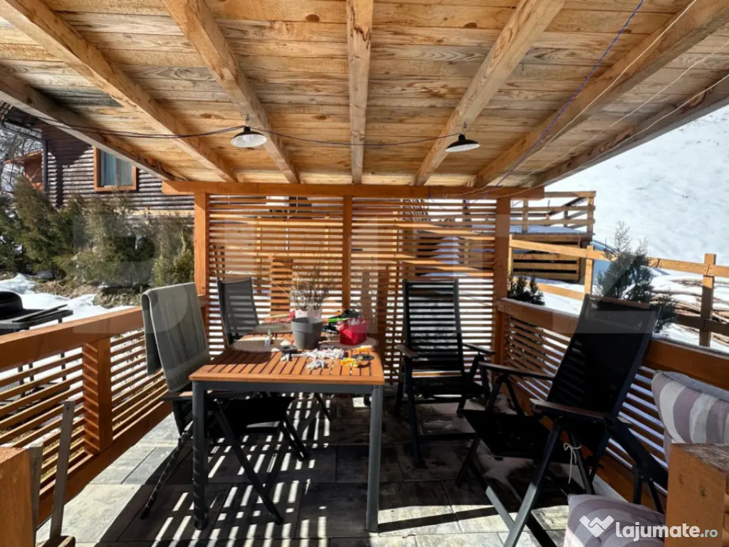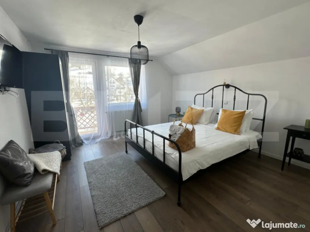 Blitz vă prezintă o oportunitate unică de a achiziționa o proprietate deosebită, perfectă pentru cei care își doresc să trăiască în mijlocul naturii, într-un cadru pitoresc și autentic, dar și o sursă sigură de venit. Această proprietate impresionantă cuprinde atât o pensiune elegantă, cât și o casă spațioasă, oferind un spațiu generos și calitate deosebită a finisajelor. Caracteristici cheie ale proprietății: Pensiune elegantă: cu un design rafinat și un decor sofisticat, pensiunea reprezintă inima acestei proprietăți. La parter, veți găsi un living primitor, o bucătărie complet utilată, o baie modernă și o debara practică. Toate aceste spații au fost gândite pentru a oferi o experiență deosebită oaspeților dumneavoastră. Dormitoare spațioase: etajul pensiunii este dedicat odihnei și relaxării. Aici, veți descoperi două dormitoare elegante, fiecare având baie proprie. Fiecare detaliu a fost atent ales pentru a crea un mediu liniștit și confortabil. Apartament independent: proprietatea dispune și de un apartament separat, care include o bucătărie complet echipată și o baie privată. Acesta oferă opțiuni nelimitate, de la spațiu pentru oaspeți, până la spațiu de lucru sau locuință pentru membrii familiei. Curte generoasă: cu un teren spațios de 970 mp, veți avea o curte generoasă pentru a vă bucura de natură și a petrece momente prețioase în aer liber în cele 2 foișoare. Spațiul vă oferă posibilitatea de a crea grădini minunate, zone de relaxare și de a vă bucura de peisajul împrejurimilor. Calitate superioară a finisajelor: atât pensiunea, cât și casa, au fost finisate cu materiale de înaltă calitate și atenție la detalii. Fiecare element reflectă un nivel înalt de artizanat și stil, asigurând o experiență de locuire și ospitalitate fără compromisuri. Conexiune cu natura, fără a compromite confortul: această proprietate oferă un echilibru perfect între viața modernă și frumusețea naturală. Veți putea să vă bucurați de liniște și peisaje magnifice, fără a renunța la comoditățile și facilitățile de zi cu zi. Această proprietate reprezintă o șansă deosebită de a investi într-o viață autentică și plină de frumusețe naturală, fără a sacrifica confortul și stilul. Pentru mai multe informații sau pentru a programa o vizionare, vă rugăm să ne contactați. Cod ofertă / ID BLITZ: P90624 Id intern: P90624 Număr niveluri imobil: 1 Număr Băi: 4 Nr. locuri parcare: 3 Curent Apă