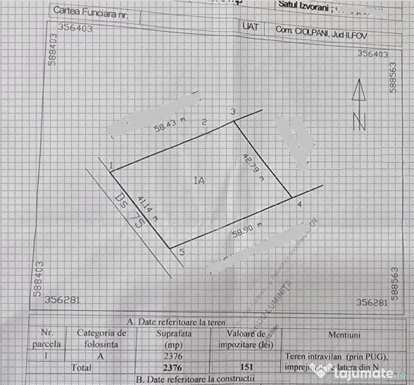 La 30 km de centrul Bucurestiului pe DN 1 in Comuna Ciolpani Sat Izvorani teren de 2370 mp cu deschidere 41 m la Sos Principala Nicolae Grigorescu . La capatul terenului sunt toate utilitatile si terenul este plan cu vecinatati case . Terenul se preteaza pt vile camin de batrani sau supermarket. Eventual suprafata se poate extinde cu inca 2370 mp cu deschidere la Str Compex Olimpic.