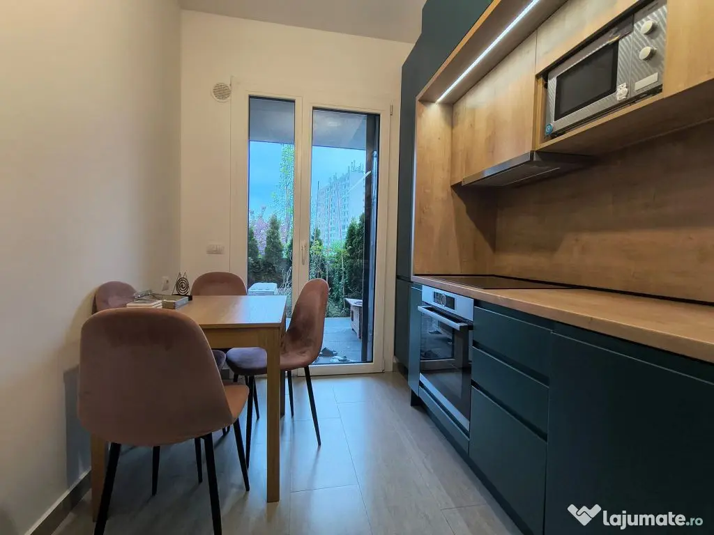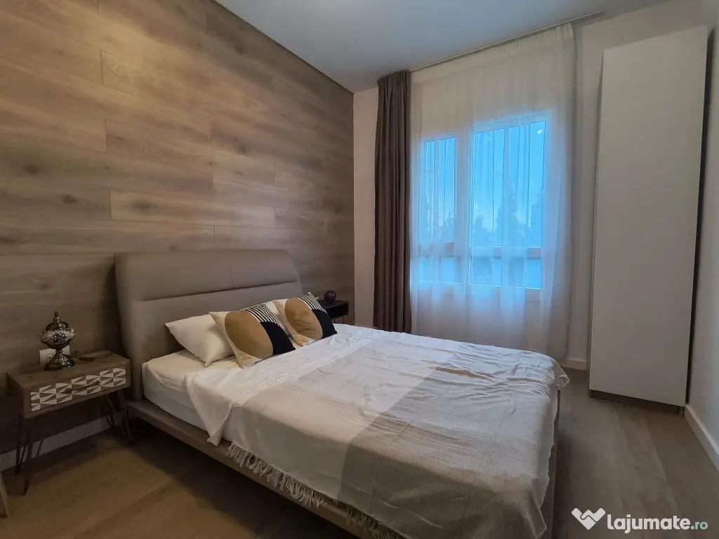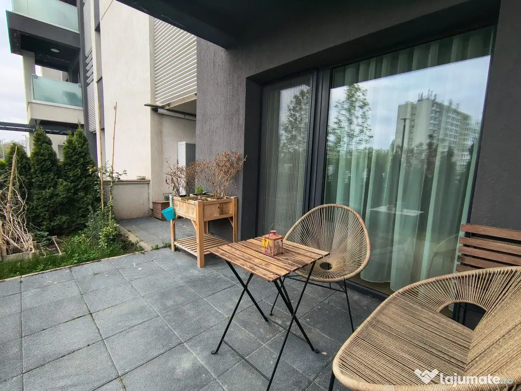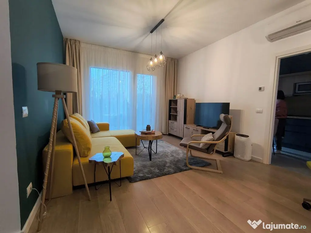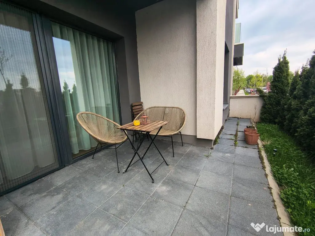Ofer spre închiriere un apartament cu 2 camere, finisaje de lux, situat la parter și cu terasă proprie, într-un ansamblu rezidențial premium. Complexul dispune de pază permanentă, acces controlat prin barieră și parcare proprie.
