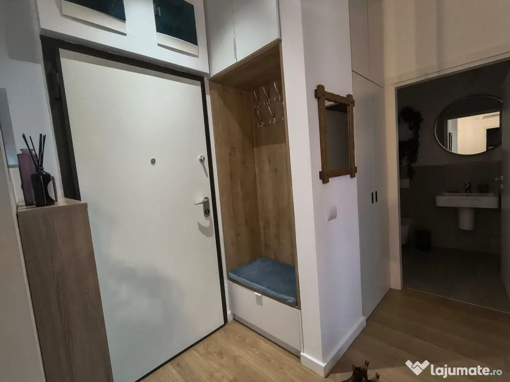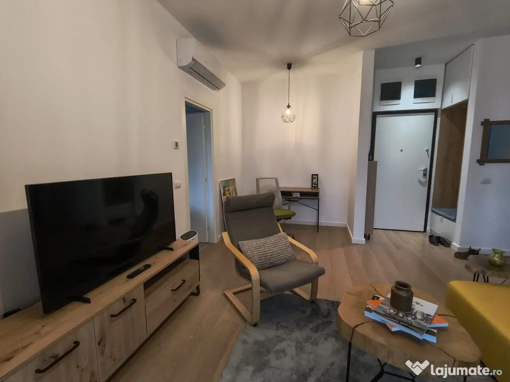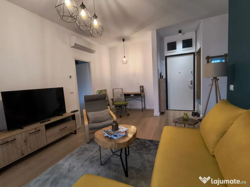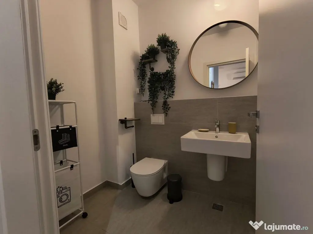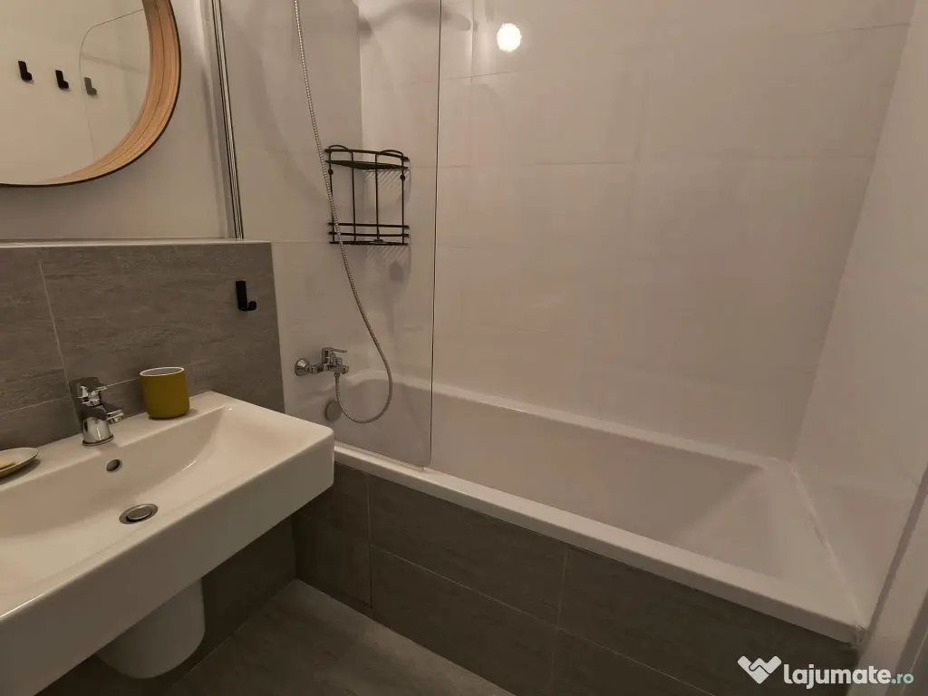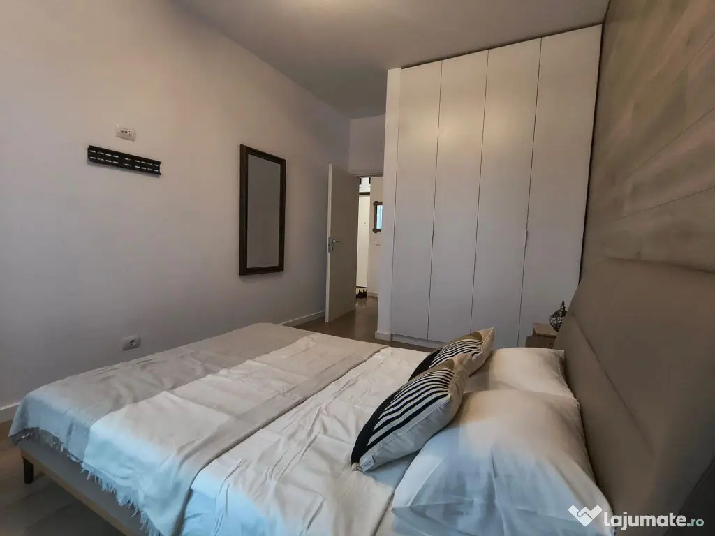 Ofer spre închiriere un apartament cu 2 camere, finisaje de lux, situat la parter și cu terasă proprie, într-un ansamblu rezidențial premium. Complexul dispune de pază permanentă, acces controlat prin barieră și parcare proprie.
