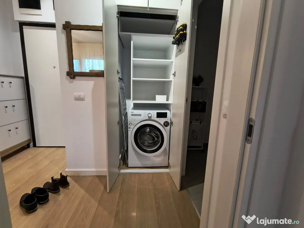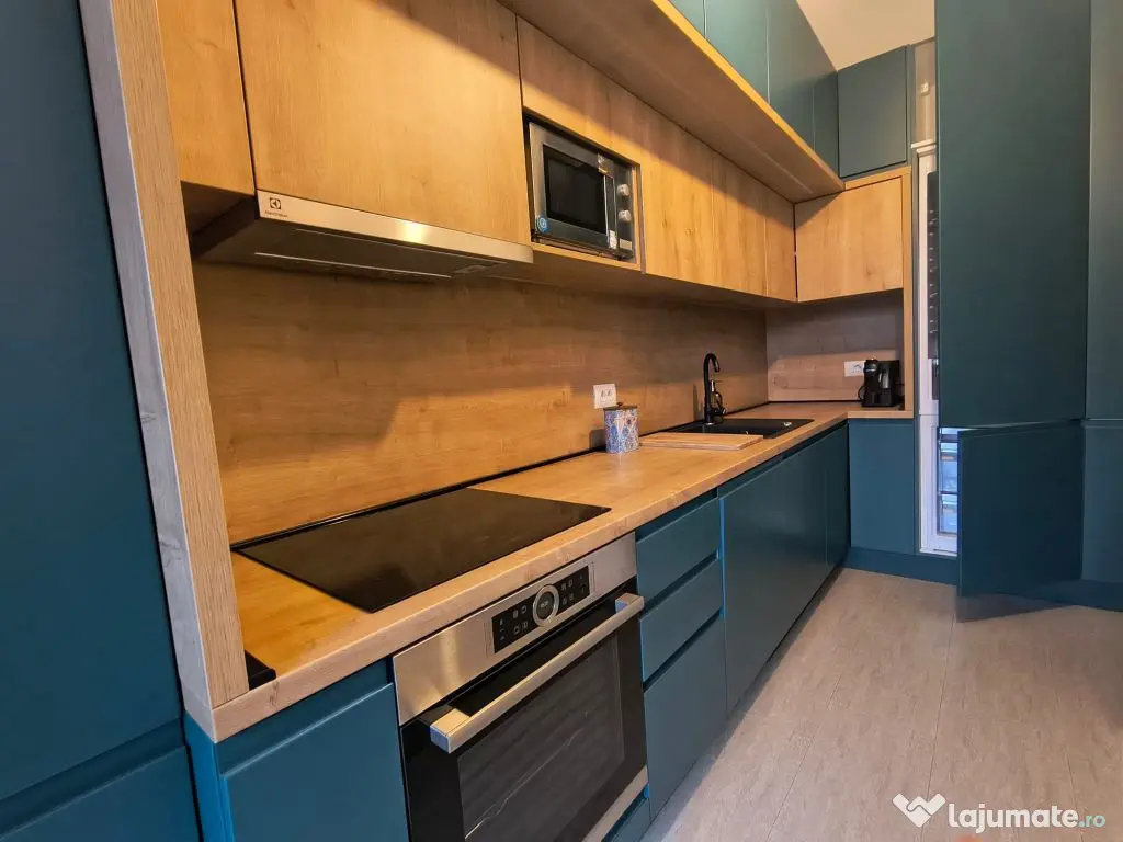 Apartamentul este complet mobilat și utilat modern – include aer condiționat, bucătărie echipată cu plită pe gaz, cuptor electric, frigider, hotă, mașină de spălat vase și cuptor cu microunde.