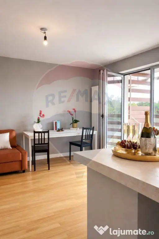 Compartimentarea interioară este atent gândită pentru confort și funcționalitate: Living open-space cu bucătărie complet utilată și acces direct către terasa generoasă