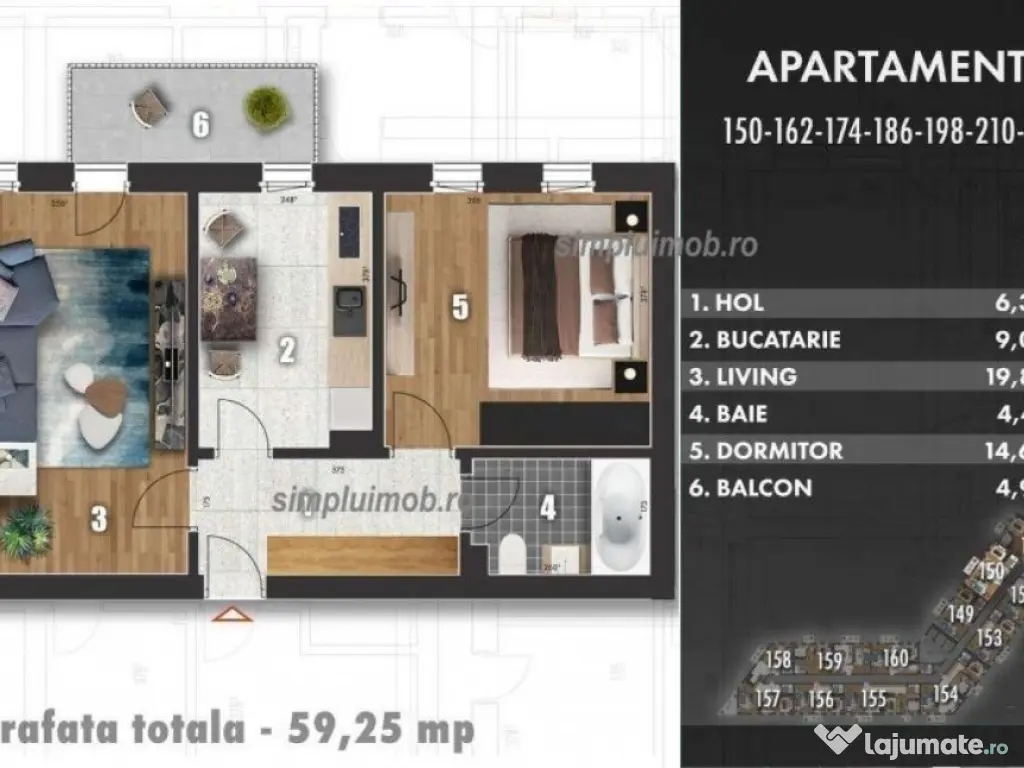 Apartamentul are o suprafață totală de 59,25 mp, din care balconul însumează 4,97 mp, oferind un spațiu bine compartimentat, ideal atât pentru locuit, cât și pentru investiție. Este dotat cu centrală termică proprie, asigurând confort și eficiență energetică.