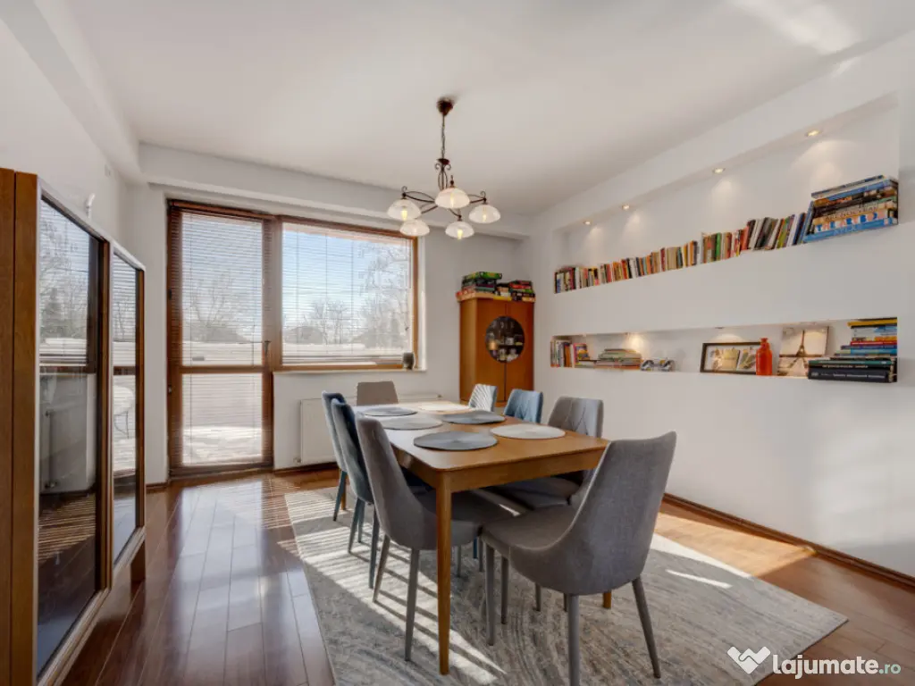 Noua pe piata ! Comision 0 % pentru Chirias ! Va prezint spre inchiriere o vila in duplex, situata in Prelungirea Ghencea pe Str. Funigeilor, Bucuresti, sector 5, aproape de noul bulevard Valea Larga. Distanta 450 m pana la statia STB din Prelungirea Ghencea. Vila este tip duplex, construita in anul 2008, dispusa pe subsol, parter, etaj si mansarda, cu o suprafata totala de 231 mp si un lot de teren de 300 mp. Casa se inchiriaza doar in  scop rezidential si este complet mobilata si utilata. Dispune de 4 dormitoare, 4 grupuri sanitare, 1 living, 1 bucatarie si 2 camere micute la mansarda, ideale pentru birou sau pentru hobby/sport.  Parterul- 88 mp-  este compus din bucatarie, living si dining, 1 grup sanitar, 1 dormitor folosit ca birou, 1 hol si acces catre subsol. La subsol (19,7mp) este o camera tehnica pentru centrala si un spatiu pentru depozitare amenajat cu rafturi. Bucataria este inchisa, complet mobilata si utilata FRANKE cu toate electricasnicele necesare: plita, cuptor, hota, cuptor cu microunde, masina de spalat vase, frigider, toate incorporate. Tot mobilierul de bucatarie este din lemn masiv. Baia parterului este amenajata cu cabina de dus si beneficiaza de fereastra. Livingul este generos, cu o suprafata de 40 mp si este impartit in doua zone, o zona de dinning cu acces catre terasa exterioara si o zona de relaxare.  Etajul 1- 95 mp- este compus din 3 dormitoare (dintre care 1 dormitor matrimonial (18,22 mp) cu baie proprie(9,71mp), dressing (9,45mp) si balcon, zona master bedroom avand o suprafata totala de 37mp), 1 grup sanitar care deserveste celalate 2 dormitoare si 1 hol. Dormitoarele sunt complet mobilate.  Mansarda- aprox 30 mp utili-  este compartimentata in 2 camere micute ( birou si spatiu destinat sportului) si un grup sanitar folosit ca spatiu de spalat rufe si uscat rufe.  Incalzirea se realizeaza prin centrala termica proprie pe gaz iar pentru racire sunt intalate 4 aparate de aer conditionat (1 AC la parter, 2 AC la etajul 1 si 1 AC la mansarda).  Imobilul este termoizolat exterior iar acoperisul este Lindab. Cladirea are structura din beton armat cu plansee din beton si ziduri interioare si exterioare din caramida. Toate baile au ferestre pentru aerisire naturala. Casa este foarte bine iluminata natural, avand ferestre orientate catre SUD-VEST.  Curtea in suprafata de 300 mp este impartita in doua zone: o zona pavata in partea din fata unde se pot parca pana 2 masini si o zona verde  amenajata cu gazon si pomi fructiferi. Imobilul este racordat la canalizarea orasului, are bransament la gaze si electricitate iar pentru apa are put forat cu pompa si dedurizator.  Casa prezentata spre inchiriere este jumatate din duplex. Se inchiriaza pe termen lung, minim 12 luni cu contract ANAF. Nu este pet friendly.  Id intern: MA20728 Număr niveluri imobil: 2 Număr Băi: 4 Comision cumpărător: 0% Nr. locuri parcare: 2 Curent Apă Canalizare Gaz Climă