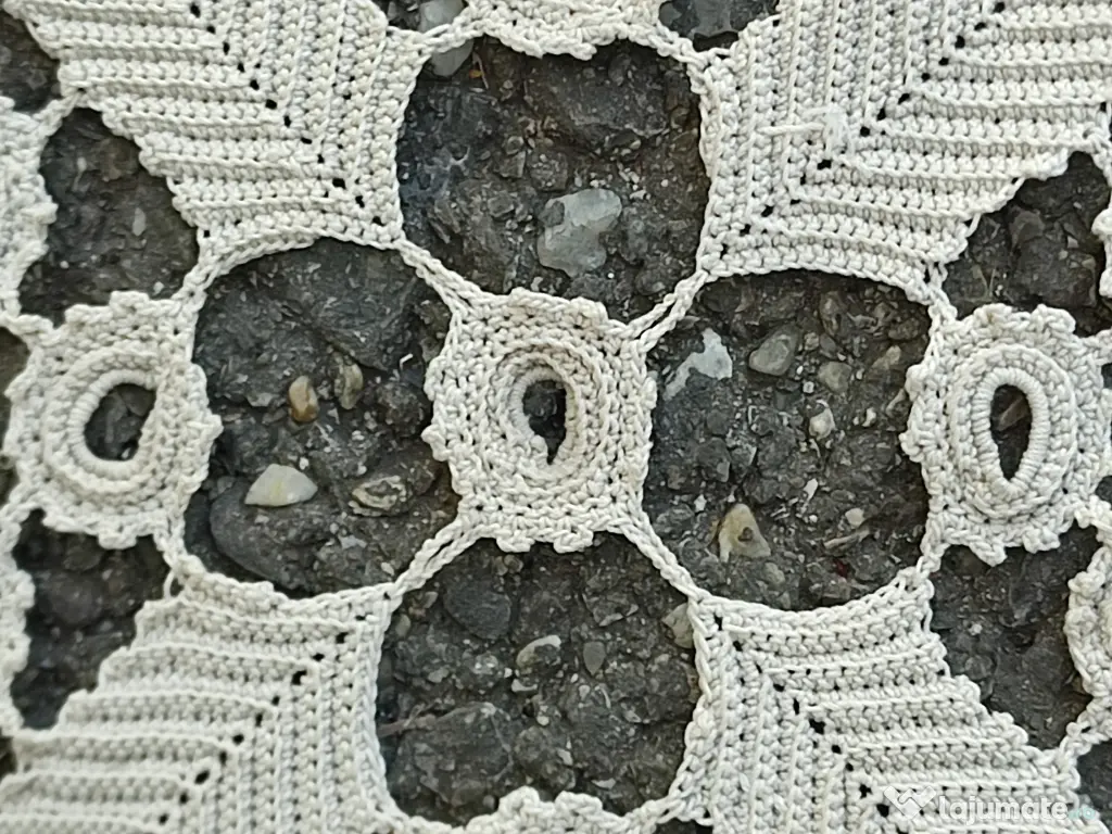 Aceasta față de masa a fost realizată cu ata specială pentru macrame si are o vechime considerabilă. O astfel de faţă de masa de marimea aceasta si o asemenea complexitate necesita multe zile de munca.