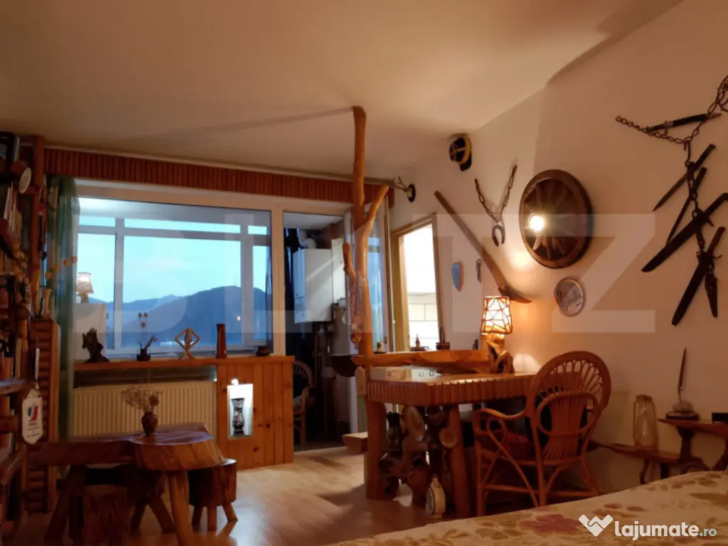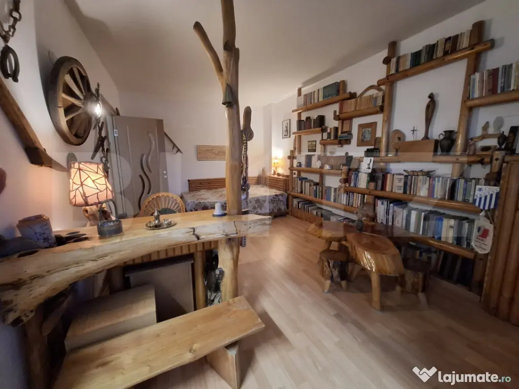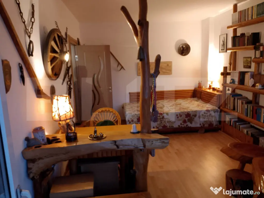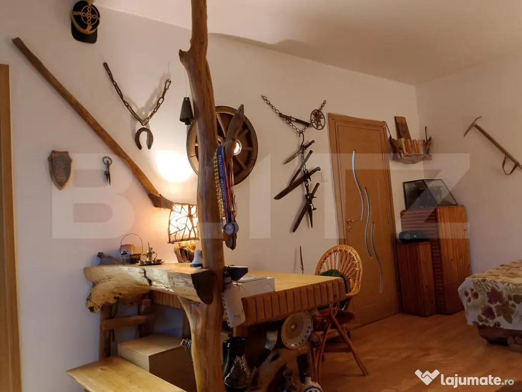 Locuința impresionează prin atmosfera caldă și primitoare, cu elemente din lemn și un design cu personalitate. Spațiul este luminos, bine compartimentat și oferă confortul necesar pentru locuire imediată.