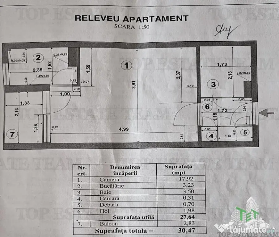 Suprafata utila a garsonierei este de 27.64 mp, suprafata totala 30.47 mp, suprafata construita 36.5 mp.