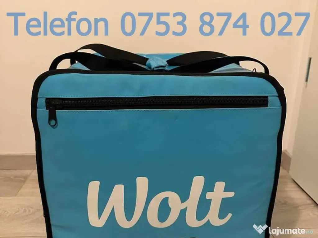 Geanta izoterma marca Wolt pentru livratori rideri distribuitori curieri livrari delivery curierat distribuire, depozitarea și transportul produselor alimentare si bauturilor.