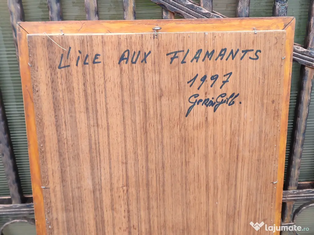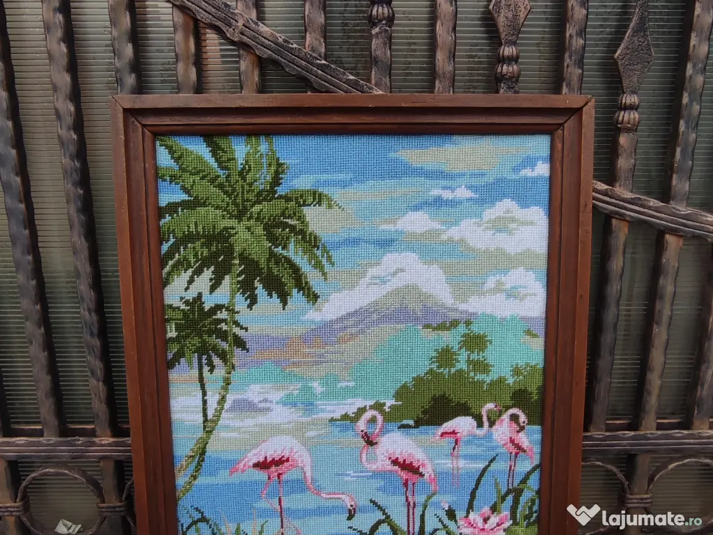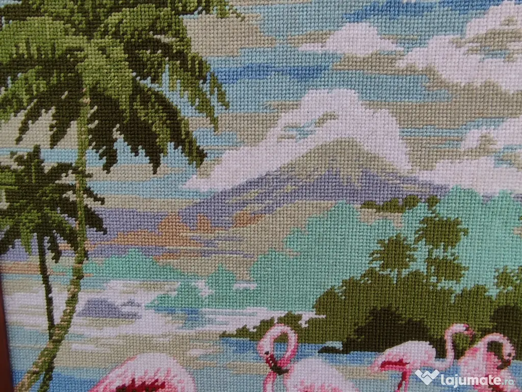 Vand goblen cu pas mare înrămat, fara geam de protecție, reprezentând o frumoasa scena tropicală cu palmieri si pasari flamingo. Realizat in 1997, goblenul are foarte multe detalii si culori vii. Dimensiuni: