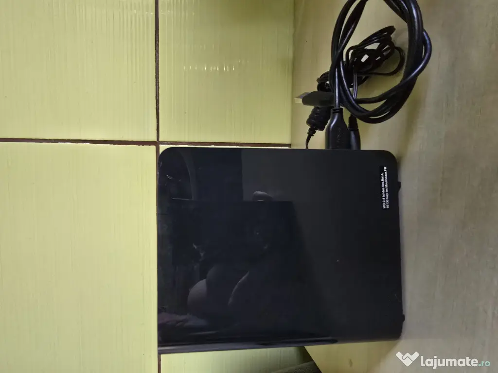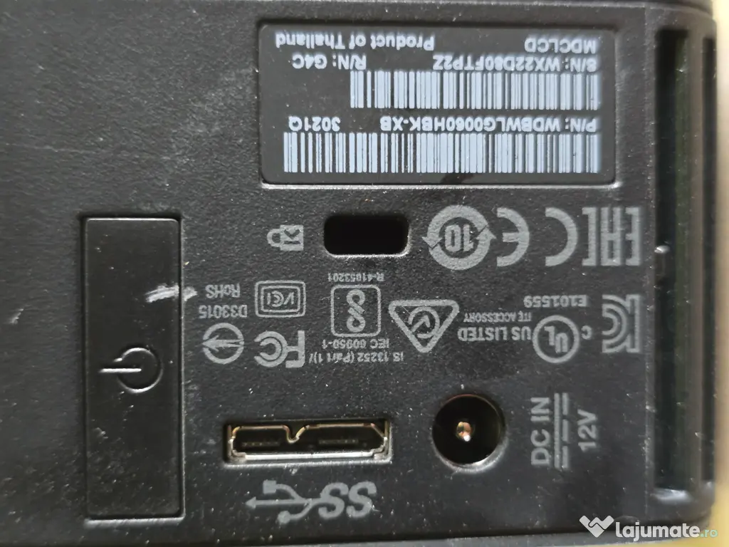 HDD extern Western Digital, capacitate 6TB. Este un model recunoscut pentru fiabilitatea în timp și vitezele bune de transfer prin USB 3.0.