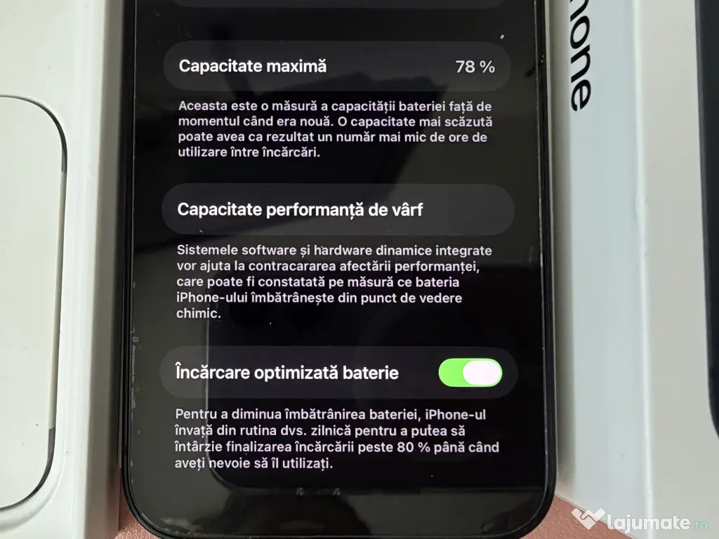 Aspect general foarte bun, cu o singură zgârietură foarte mică pe spate. Bateria are 78% sănătate.