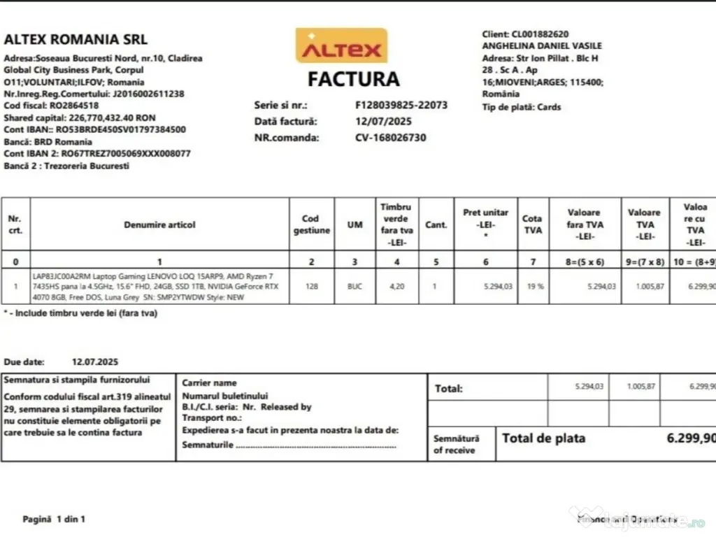 Laptop Gaming LENOVO LOQ 15ARP9, AMD Ryzen 7 7435HS pana la 4.5GHz, 15.6" FHD, 24GB, SSD 1TB, NVIDIA GeForce RTX 4070 8GB, Free DOS, Luna Grey . O dată folosit este impecabil ca nou se vinde cu geantă de transport , mouse de gaming și răcitor .