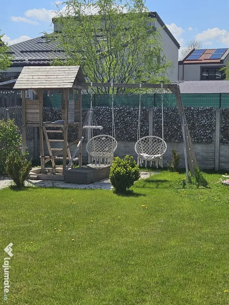Loc de joaca pt copii cu perete de catarare si tobogan(sunt demontate de aceea nu apar in poza). Leaganele nu sunt incluse. Se vinde doar locul de joaca.