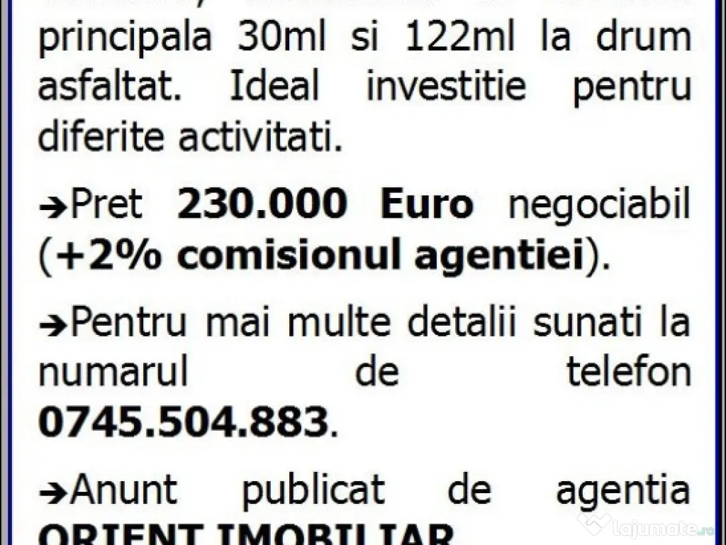 (cod7541) | LUMINA, teren intravilan de vanzare, suprafata 2.817mp, situat langa silozurile Cambela, deschidere la soseaua principala 30ml si 122ml la drum asfaltat. Ideal investitie pentru diferite activitati. Pret 215.000 Euro negociabil (+2% comisionul agentiei). Pentru mai multe detalii sunati la numarul de telefon 0745.504.883. Anunt publicat de agentia ORIENT IMOBILIAR.